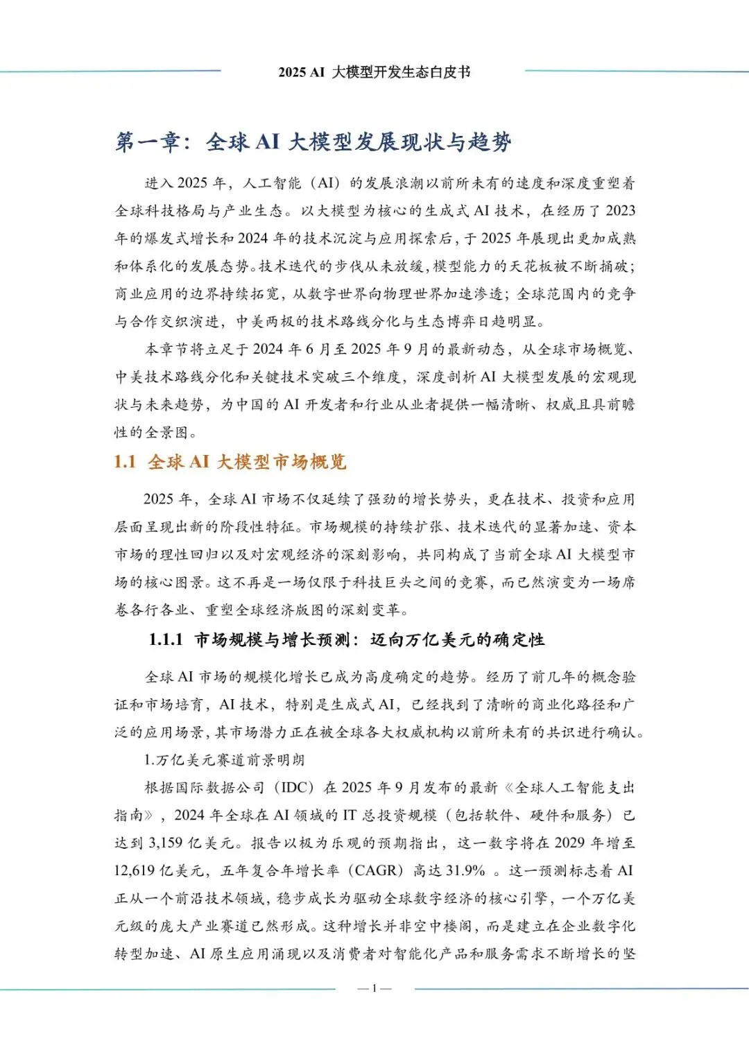 报告全景解析全球 AI 大模型开发生态,指出行业正迈向万亿美元市场,生成式 AI 是核心增长引擎,2029 年投资规模预计达 6071 亿美元。中美技术路线分化明显,中国在算力基础设施、开源生态与应用场景上快速追赶,但面临芯片依赖、人才结构等挑战,开发者生态与垂直行业应用落地成为未来竞争关键。