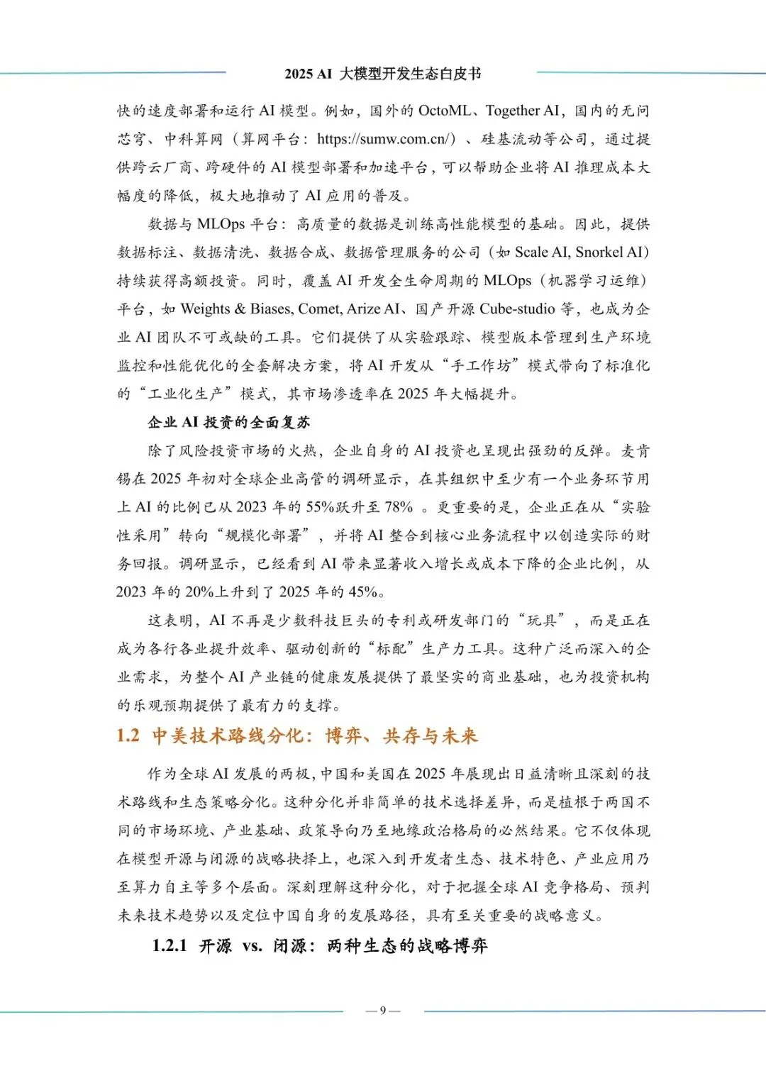 :中国算力规模跃居全球第二,“东数西算” 工程优化资源配置,智算中心建设热潮兴起。云服务平台竞争聚焦 AI 算力服务与 MaaS 模式,国产 AI 芯片面临技术与生态双重挑战,但在政策支持下,逐步实现从 “能用” 到 “好用” 的突破,为大模型开发提供自主可控的算力底座。 - 应用落地跨越 “鸿沟”,开发者生态重构