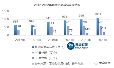 2022年,全国移动通信基站总数达1,083万个,全年净增87万个。其中,累计建成并开通5G基站为231.2万个,基站总量占全球60%以上,全年新建5G基站88.7万个,占国内移动基站总数的21.3%。