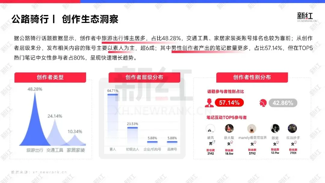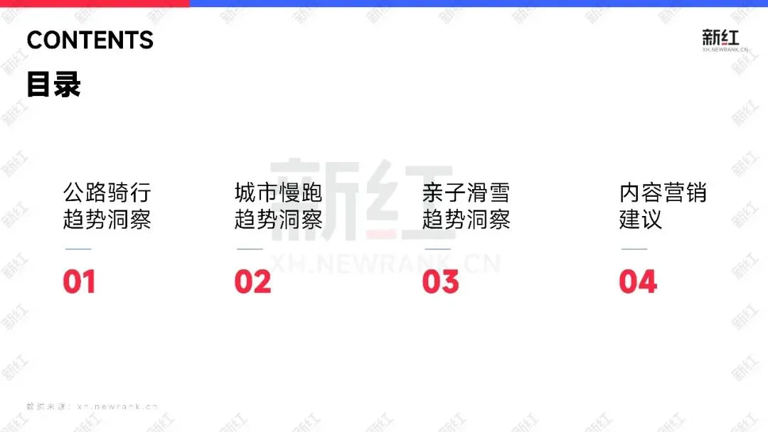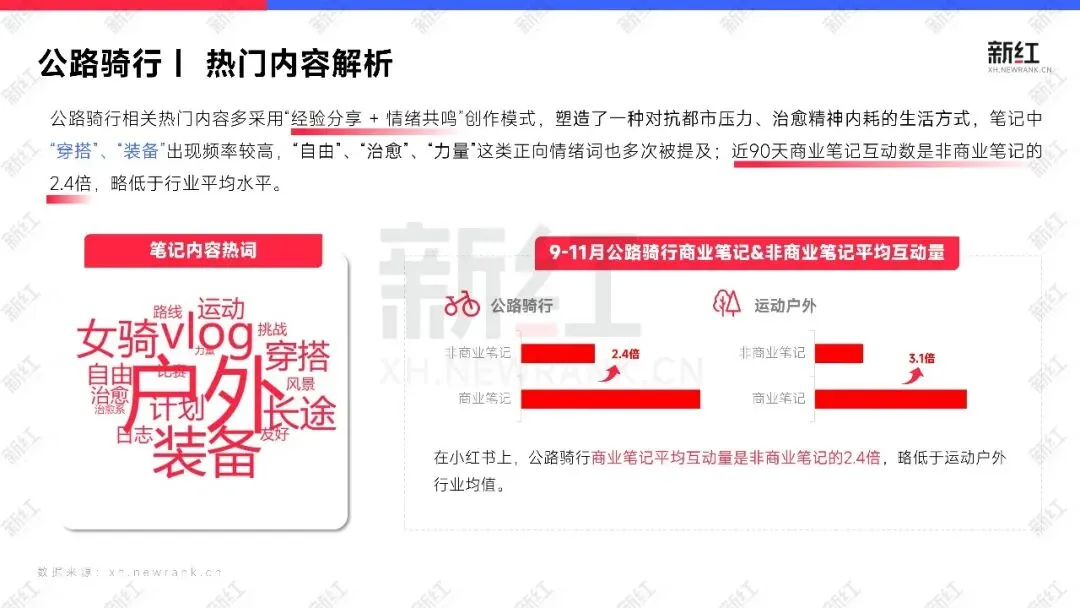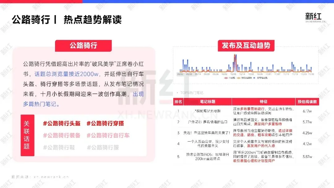 本期报告,新红将进一步调研运动户外场景下的公路骑行、城市慢跑、亲子滑雪3大细分领域,通过分析热点话题、爆款笔记、品牌营销等数据,为从业者提供具体数据支撑,可落地的内容营销建议,助力品牌在竞争激烈的市场中精准触达目标用户,实现增长破局。