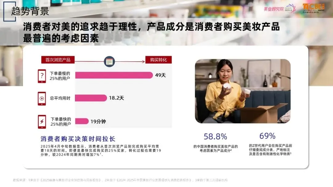 2025 化妆品原料竞争将围绕“高纯功效分子×合成生物平台×情绪嗅觉×中国植物 AI×微生态安全”五轴展开;国货凭借 63.8% 的专利占比、29% 的成本优势及 47% 的情绪叙事溢价,有望在未来 12 个月实现从“质价比”到“技术溢价”的跨越。