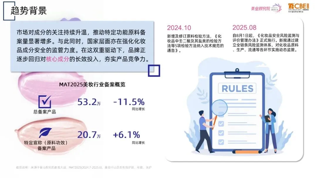 报告聚焦“功效、进阶技术、品牌自研、情绪疗愈”四大主线,梳理2024.5-2025.8 国内备案/上市新原料 63.9% 集中在功效升级,75.3% 的新品宣称“技术赋能”,国货品牌贡献 63.8% 的专利申报。通过淘系 2024 销售额同比 47.2% 的“东方香”赛道、合成生物与发酵技术渗透率提升 39.6% 等数据,预判未来 12 个月原料创新的五大方向:高纯功效分子、生物合成平台、情绪嗅觉科技、中国特色植物 AI 挖掘、微生态友好衍生物。