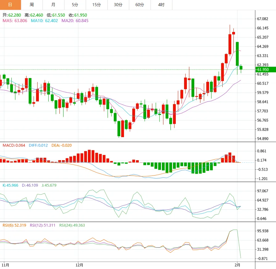 在上行方向,62.80 美元至 63.50 美元区间构成明显技术阻力,该区域不仅是前期整理平台,也是短期均线密集分布区。在未能重新站稳该区间之前,油价整体仍处于反弹易受阻、回落风险偏大的阶段。