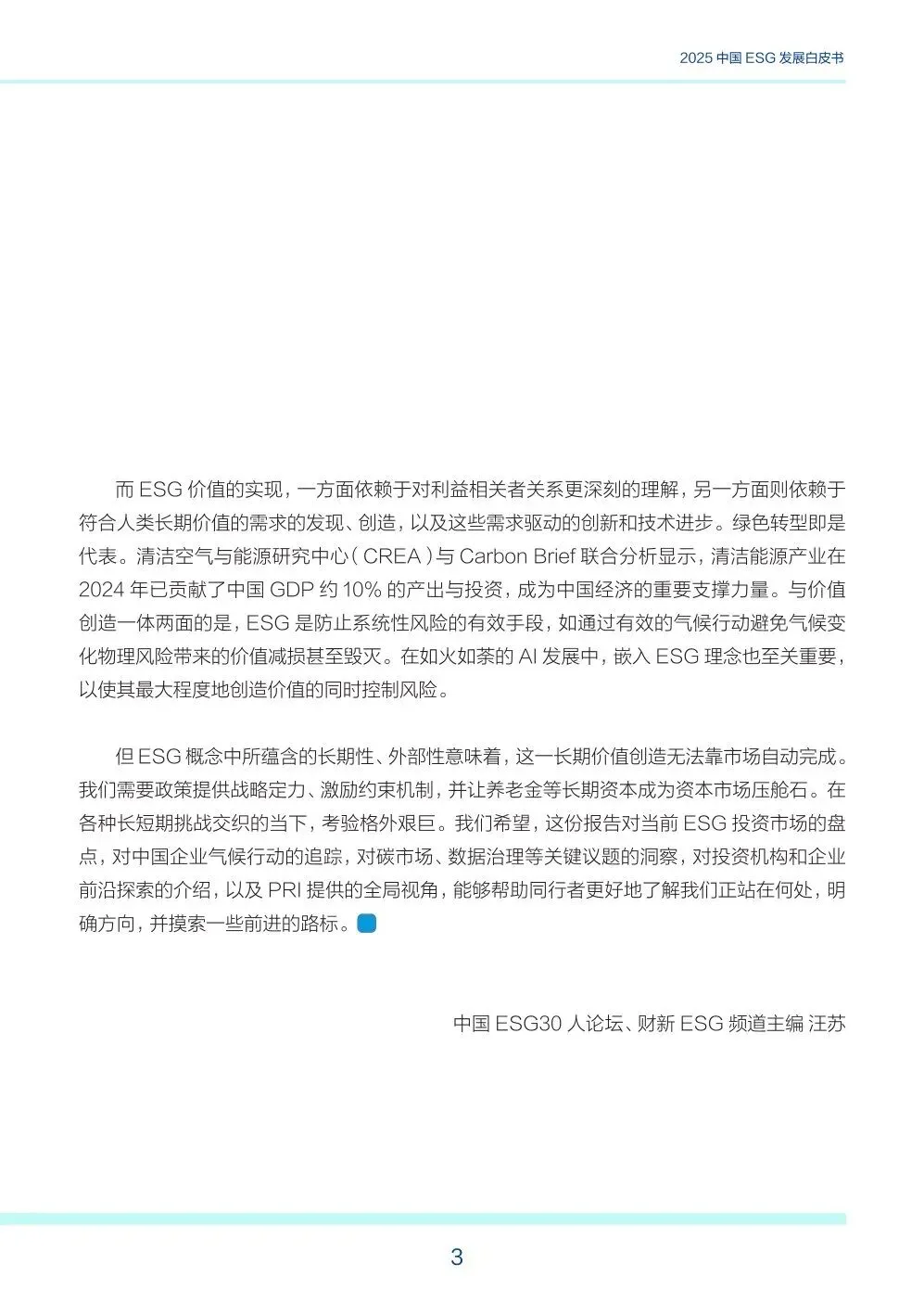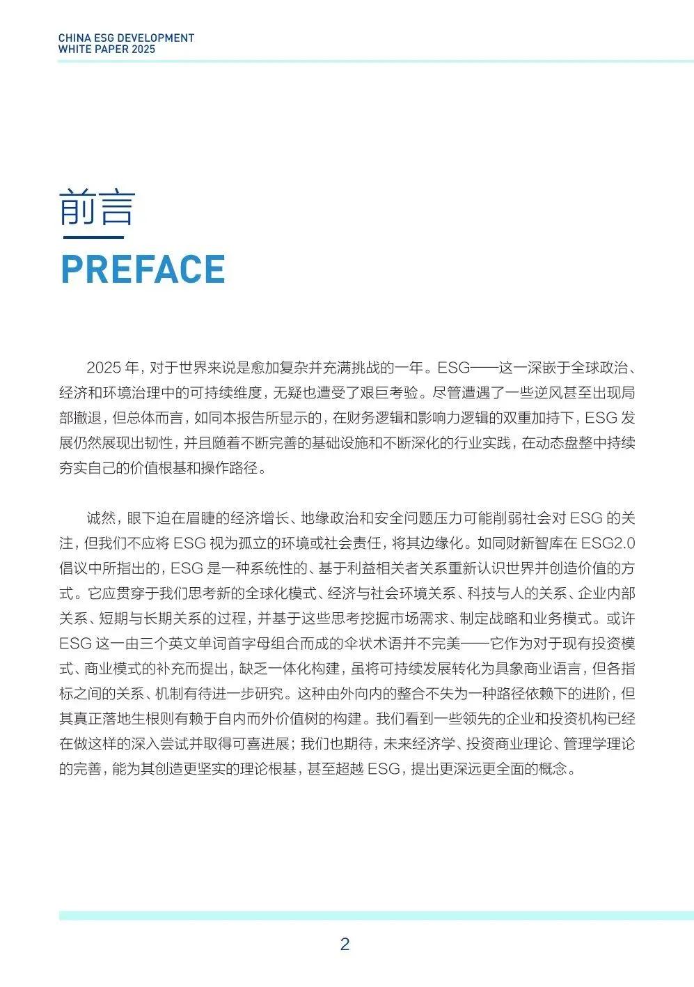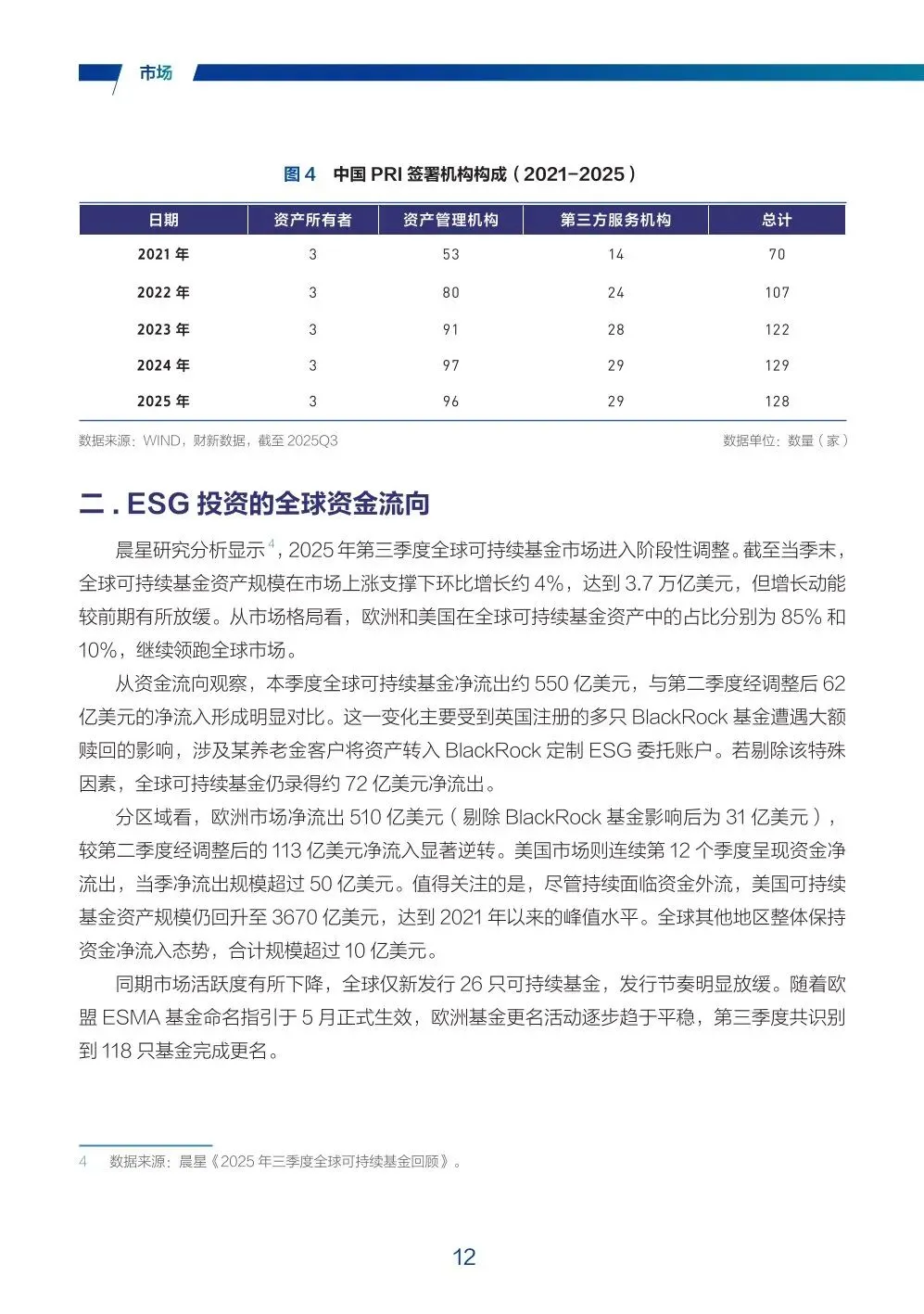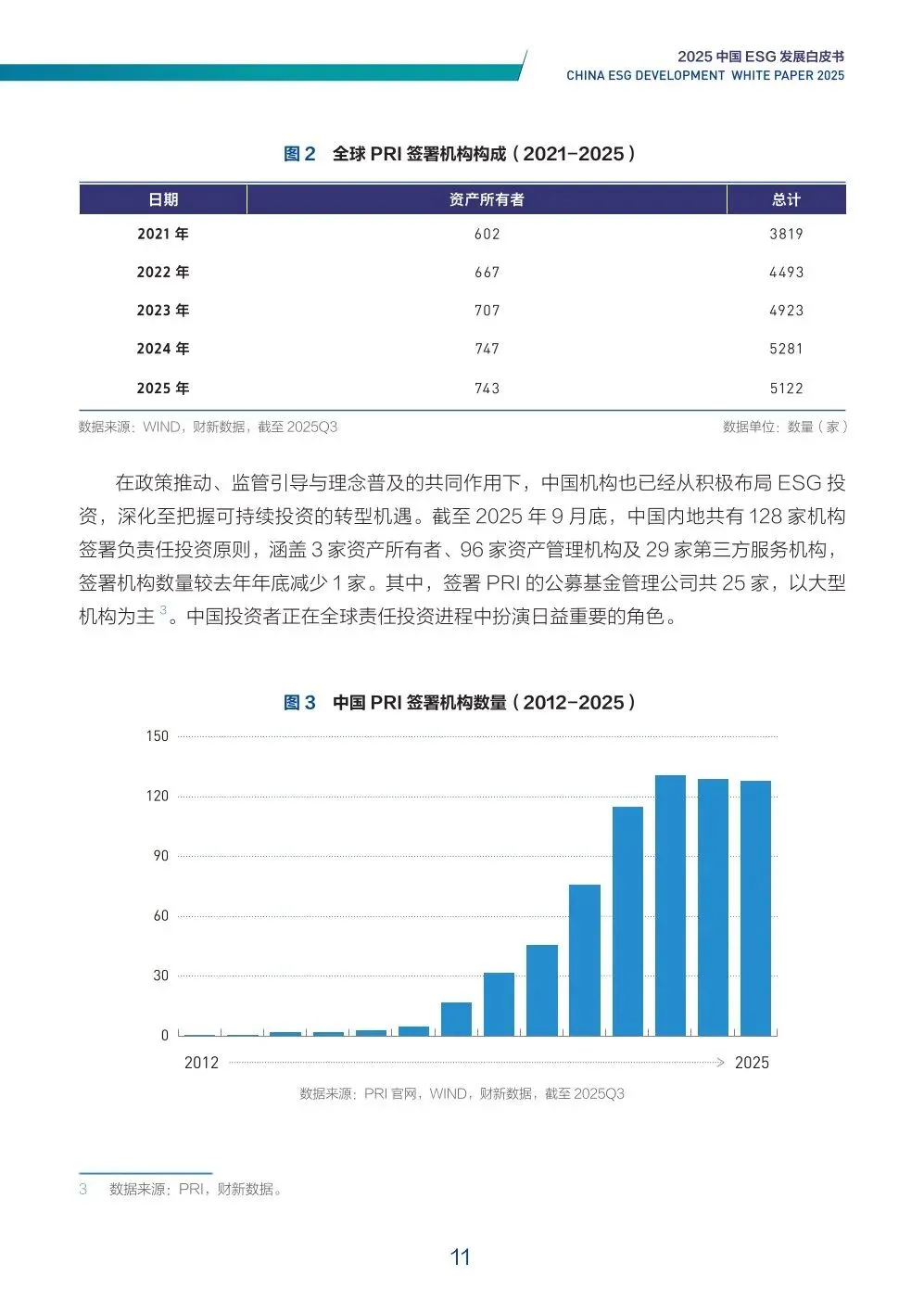 报告全面梳理中国 ESG 发展现状,指出 2025 年 ESG 投资从 “量增” 迈向 “质升”,A 股 ESG 公募基金规模回升至 2160 亿元,政策体系日趋完善,上市公司披露率持续提升。但行业仍面临数据质量不足、评价标准不统一、“漂绿” 风险等挑战,企业气候转型准备度低于全球同行,ESG 需深度融入企业战略与投资决策。