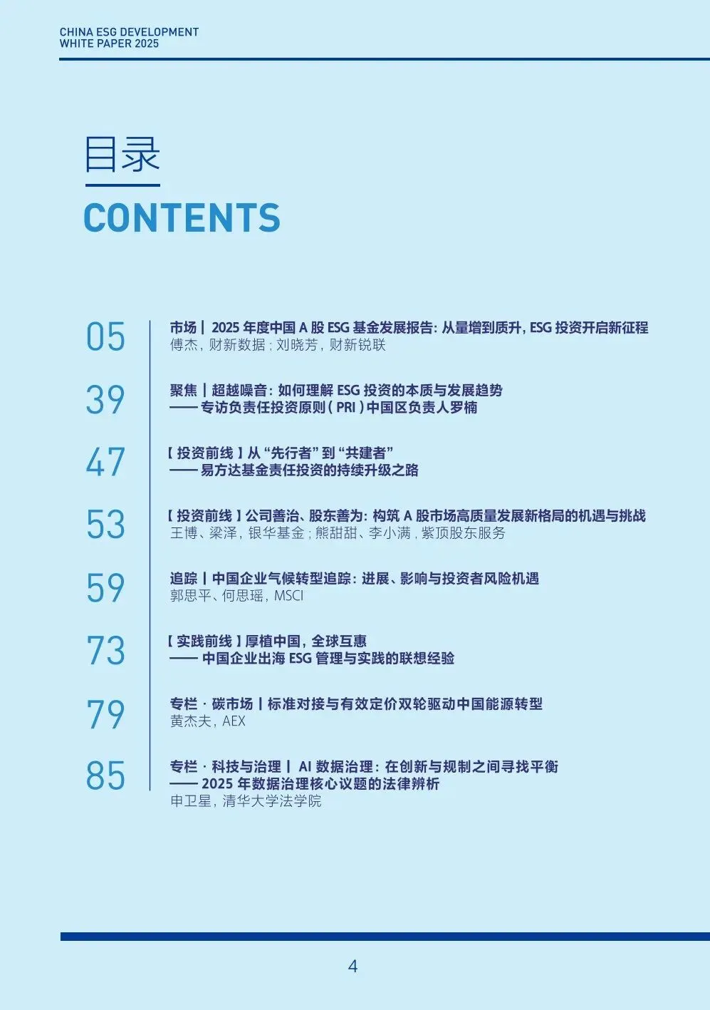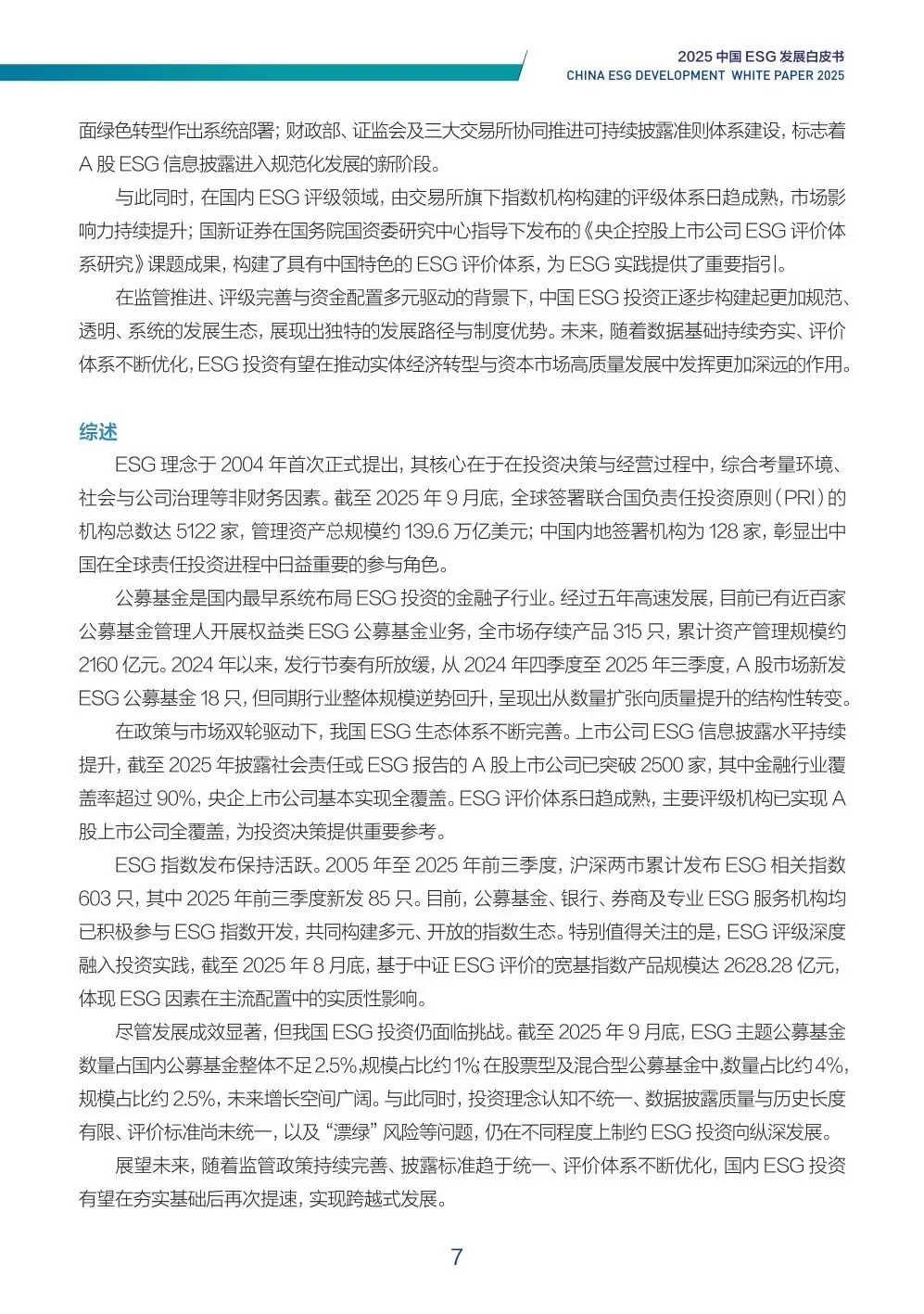 :当前 ESG 投资面临数据披露质量有限、评价标准不统一、专业人才短缺等问题,“漂绿” 风险需警惕。未来机遇在于政策驱动下的绿色转型需求,央企与上市公司 ESG 实践深化,生物多样性、AI 数据治理等新兴议题受关注,长期资金入市与被动产品崛起将推动 ESG 投资向纵深发展。
