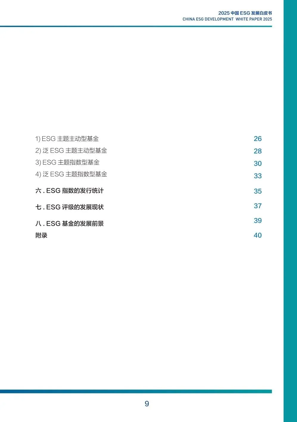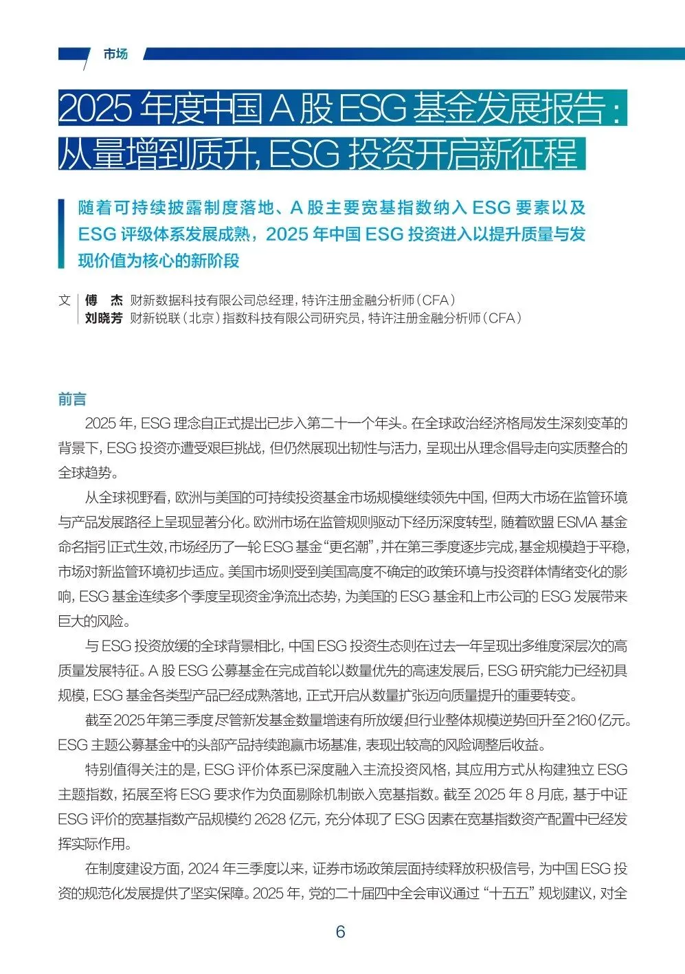 :全球 ESG 投资遇挫背景下,中国 ESG 公募基金在 2024Q4-2025Q3 新发 18 只,规模逆势回升至 2160 亿元,头部产品跑赢市场基准。ESG 评价体系深度融入宽基指数,基于中证 ESG 评价的宽基指数产品规模达 2628 亿元,泛 ESG 主题主动型基金占比超 45%,成为市场主流。 - 政策体系逐步完善,信息披露走向规范