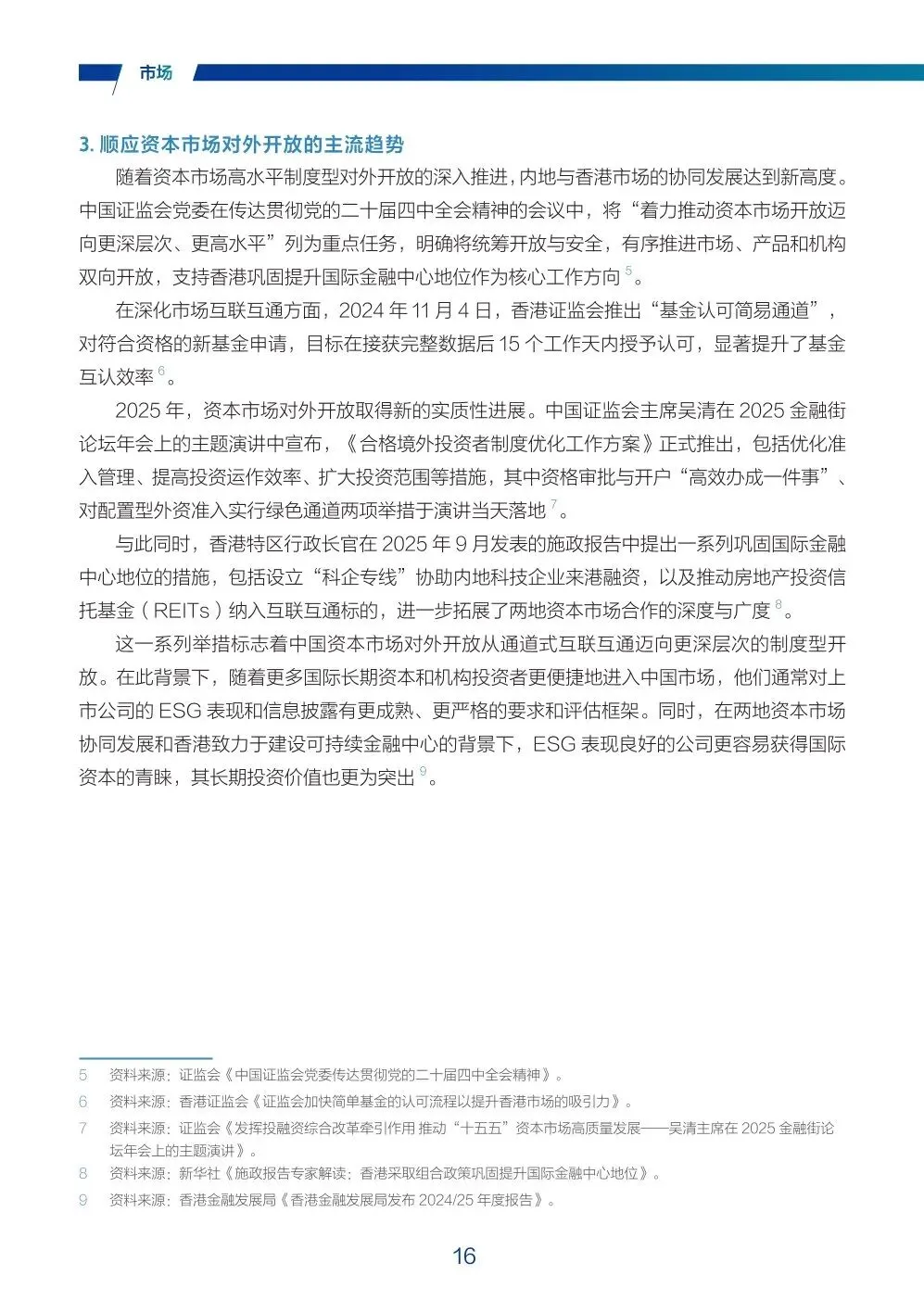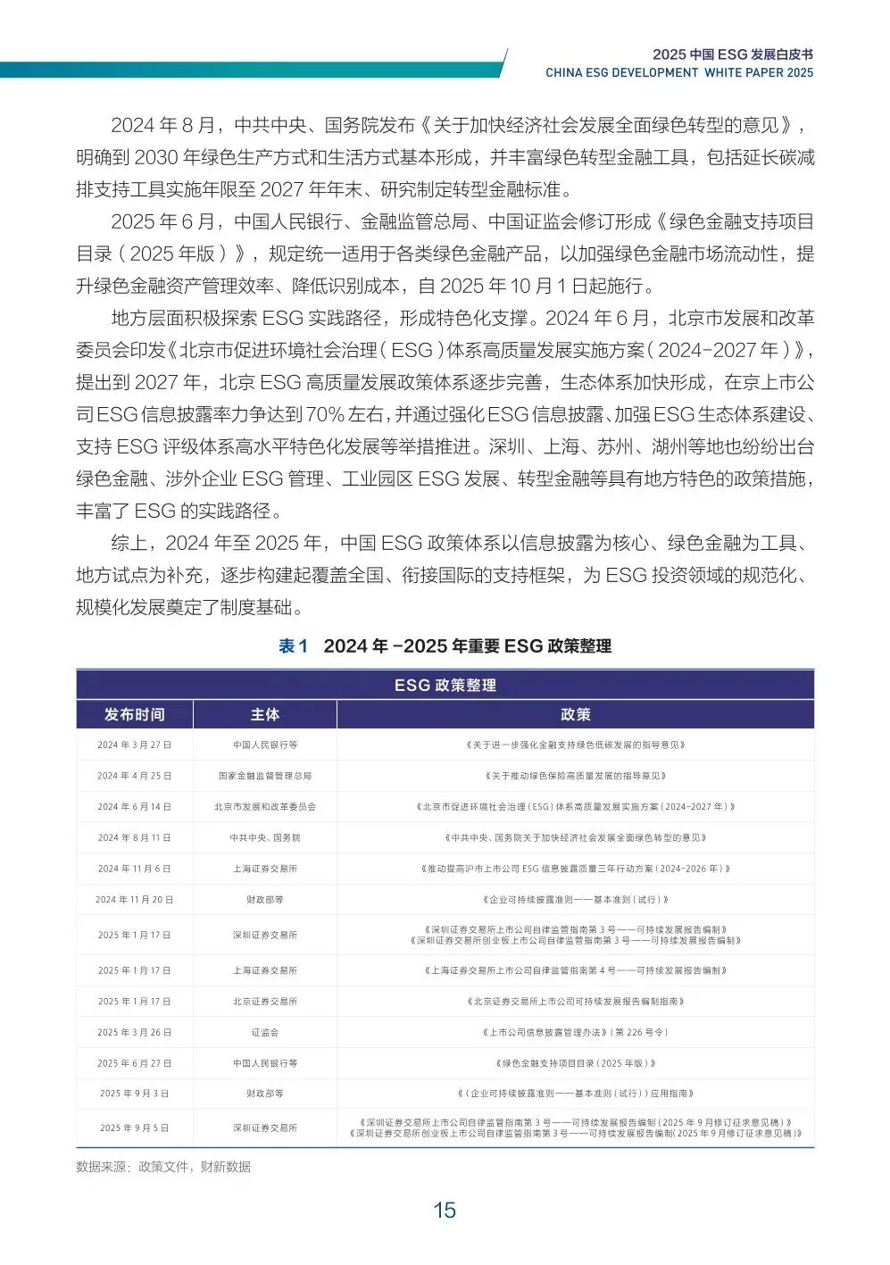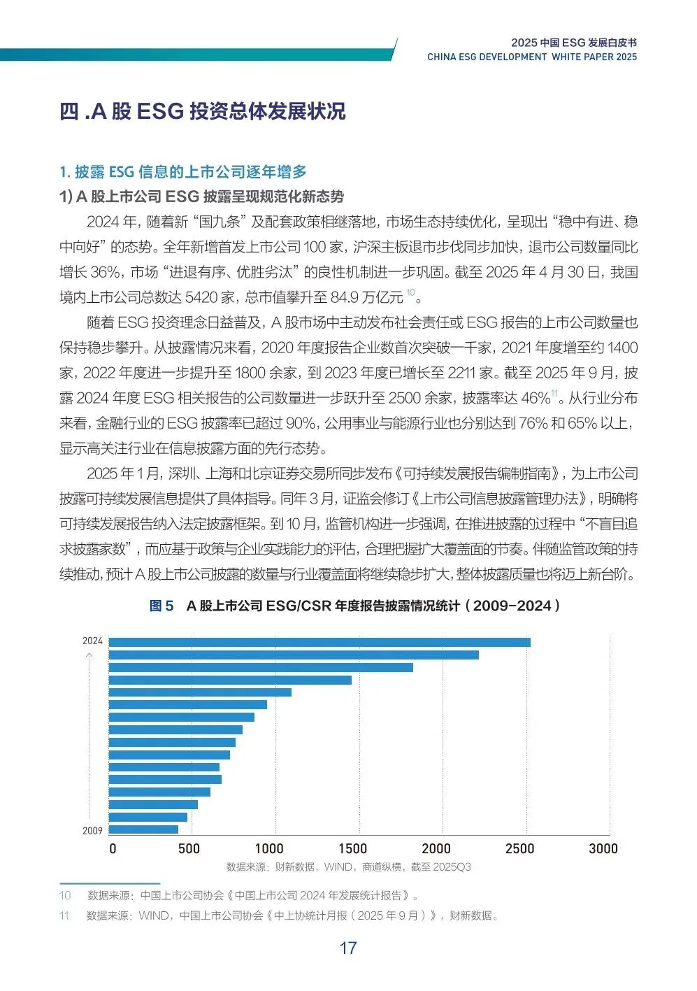 :2024-2025 年,财政部、证监会及三大交易所密集出台政策,构建以信息披露为核心、绿色金融为工具、地方试点为补充的支持框架。A 股上市公司 ESG 报告披露率达 46%,金融行业超 90%,央企基本实现全覆盖,香港联交所披露与国际标准全面接轨,为 ESG 投资提供数据支撑。 - 企业气候转型进展与风险并存