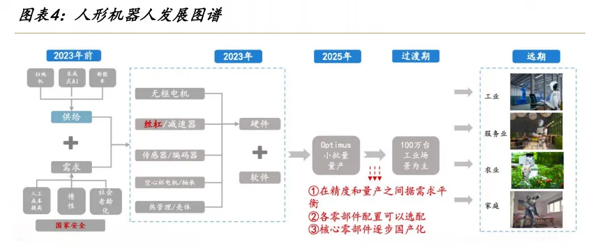 在以特斯拉为首的科技巨头持续发力投入以及人工智能技术不断进步的共同推动下,人形机器人产品和成本迭代速度显著加快,成为未来最确定的产业方向之一。从产品端看,24 年特斯拉人形围绕关节、灵巧手方案、算法训练等快速迭代,运动和认知能力大幅提升。从成本端看,随着丝杠、灵巧手、传感器等产业链迭代加速,大规模量产线的加速研发和投入使用,生产成本开始走向大幅度下降的通道。人形机器人会先从高人工成本、较低任务复杂度的领域开始迭代。