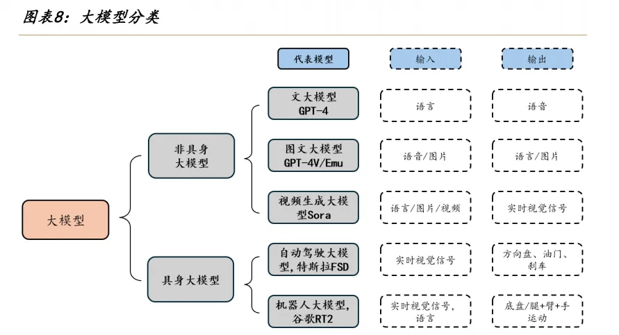 目前限制人形机器人大规模量产的重要因素是大脑进化。机器人逻辑架构由“大脑”+“小脑”+肢体组成,目前人形机器人“肢体”硬件方案趋于收敛,硬件发展整体走在软件之前。目前人形机器人“大脑”技术以大模型为核心,为人形机器人提供任务级交互、环境感知、任务规划和决策控制能力。伴随着 AI 大模型的迭代,机器人大脑实现产业实现跨越式发展,智能化程度有望提升。