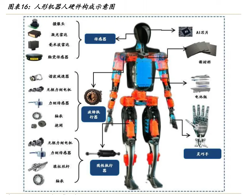 “肢体”硬件是人形机器人实现所有拟人载体和基础,主要包含执行器、传感器、灵巧手、电源、芯片和新材料结构件等。