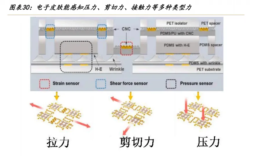 电子皮肤是是新型的仿生柔性触觉传感系统,通过柔性传感器进行信号感知转换。从表面的接触方向来看,电子皮肤能够感知压力、剪切力、接触力等多个类型的力,能够助力机器人在手部实现更加精细的操作。电子皮肤主要分为基底层、导电层、传感层。