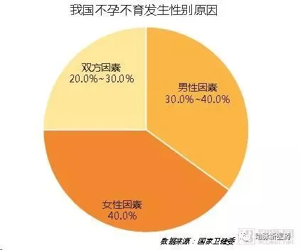不孕不育因素可能在女方、男方或男女双方,国家卫健委的资料显示,由于性别因素造成的不孕不育,男性因素占30%~40%,女性因素占40.0%,双方因素占20.0%~30.0%。