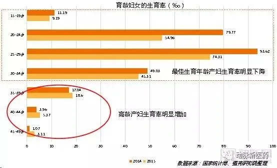 5、在初婚及初育年龄推迟及“二孩”政策的共同作用下,孕龄妇女呈现出最佳生育年龄产妇生育率下降及高龄产妇大幅增长的现象,行业风口已显,等待迎风起航。