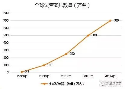 国际辅助生育技术监控委员会的研究显示,从1990年到2013年,全球试管婴儿的数量由大约9.5万名增长到了超过600万名,整体增长超过6400%,年复合增长率达19.8%。
