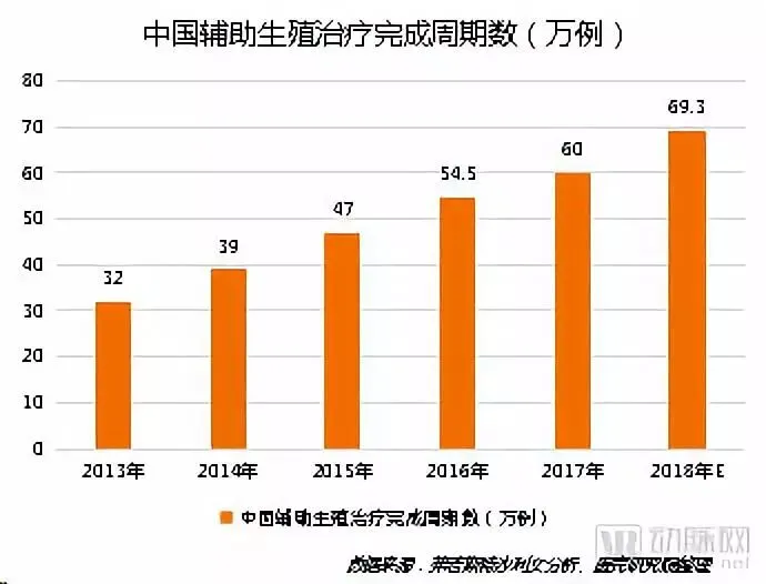 同时按照弗若斯特沙利文分析的数据,2017年辅助生殖周期总数为60万例,预计2018年,辅助生殖行业总计将完成约69.3万周期,同比增长15.5%。