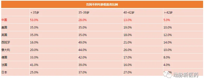 而中国的患者年龄主要集中在35岁以下,其占比高于其它国家,达到了53.0%;35~39岁的患者占比也达到28.0%;42岁以上患者占比最少,为5.0%。