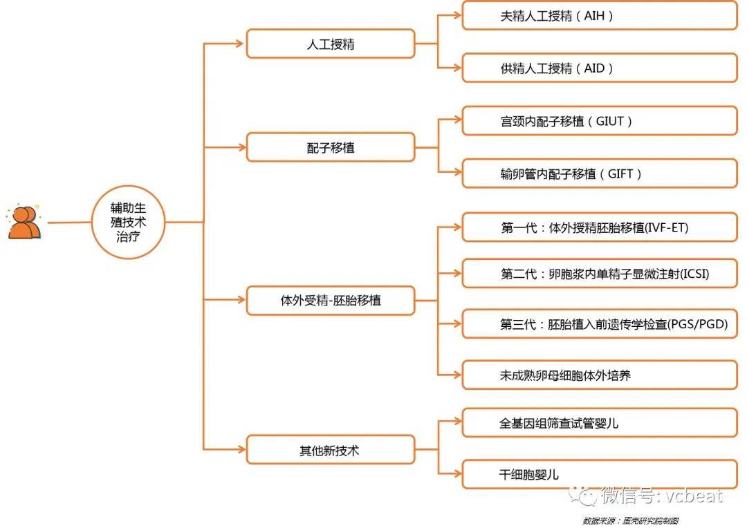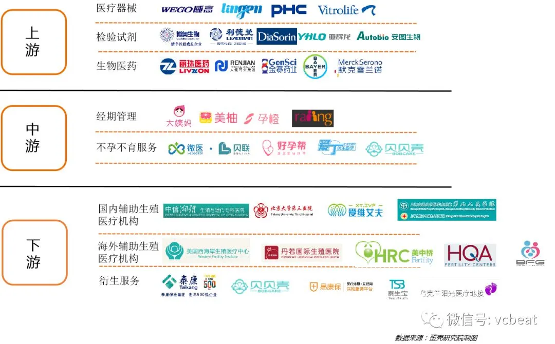 其中,上游主要覆盖:医疗器械、检验试剂及生物医药;中游主要指两类企业:提供泛健康经期管理及垂直不孕不育服务的”互联网+”辅助生殖的企业;下游则为:国内/海外辅助生殖医疗机构及提供衍生服务机构。