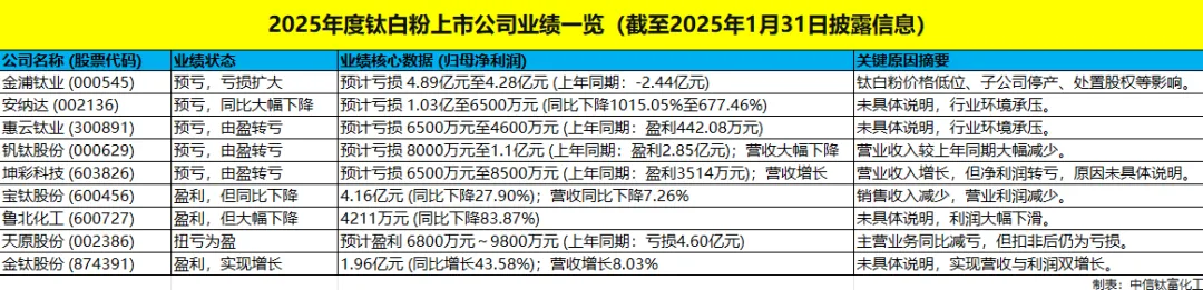 近期,多家钛产业链上市公司披露2025年度业绩预告或报告,整体表现呈现分化态势。以下为各公司业绩情况整合: