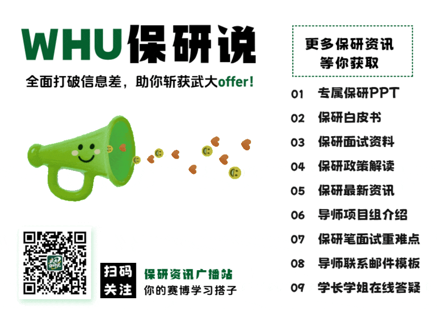 武汉大学各学院推免细则、夏令营&预推免招生要求及细则、武汉大学各学院拟录取名单、保研常识扫盲、保研硬件&软件准备、文书准备、复试考核对策、保研四年规划。