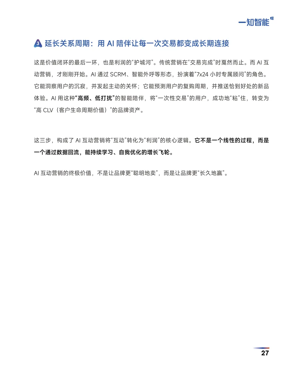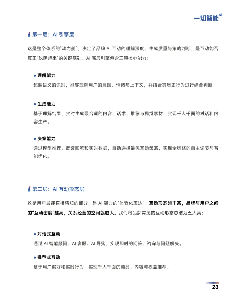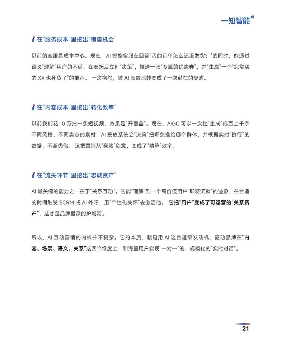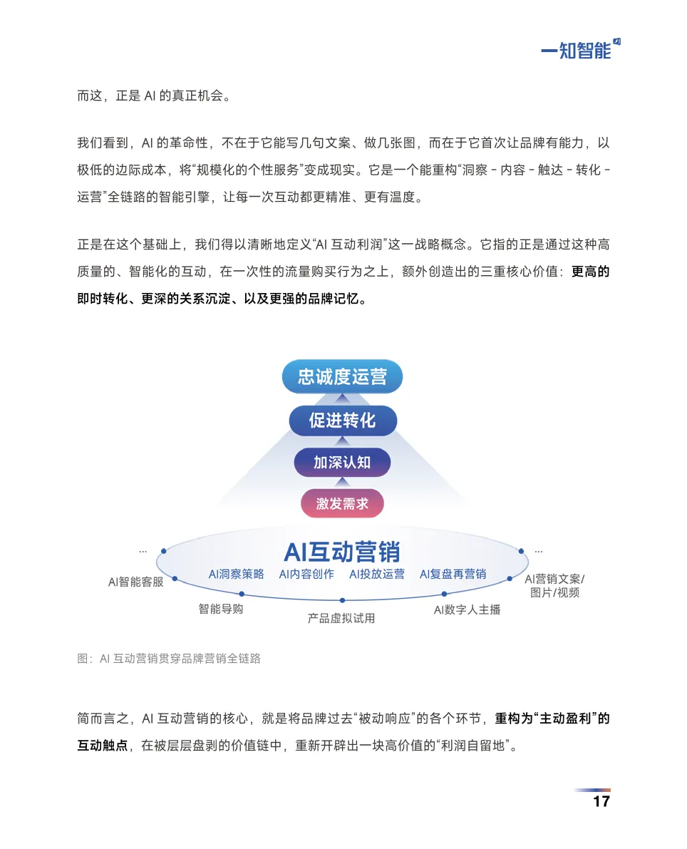 导读:报告聚焦 AI 技术对品牌营销的革新,剖析流量红利消退后行业从 “流量经营” 向 “关系经营” 的转型逻辑。白皮书指出,当前品牌面临成本高企、运营失焦、数据分散等困境,消费者决策路径碎片化与 AI 工具应用迷航加剧增长焦虑。AI 互动营销以 “模型为根、场景为干、增长为冠”,通过理解、生成、决策三大核心能力,构建 “公域 - 私域 - 内容” 全域互动体系,实现规模化与个性化的平衡。针对不同类型品牌,白皮书提供定制化增长方案,内容驱动型品牌可借 AI 放大创意产能,体验驱动型品牌能用 AI 精炼线索,关系经营型品牌可通过 AI 守护用户生命周期价值,渠道驱动型品牌则依托 AI 实现全域协同。一知智能通过 “太一” 垂直大模型与多 Agent 矩阵,已助力 2000 + 头部品牌实现互动质量与转化效率的双重提升,为行业提供可落地的 AI 营销解决方案。
