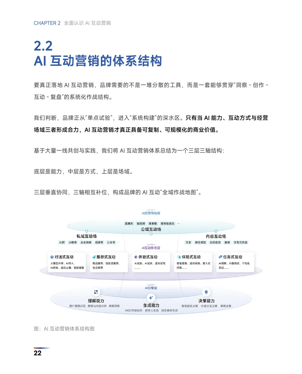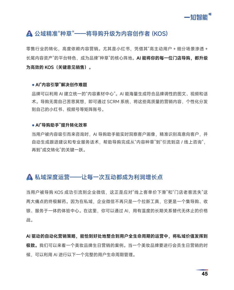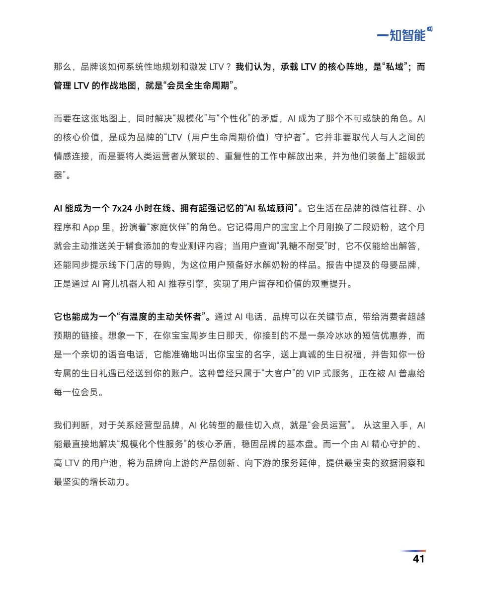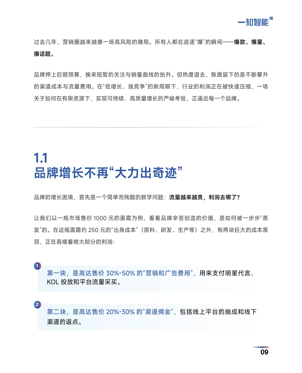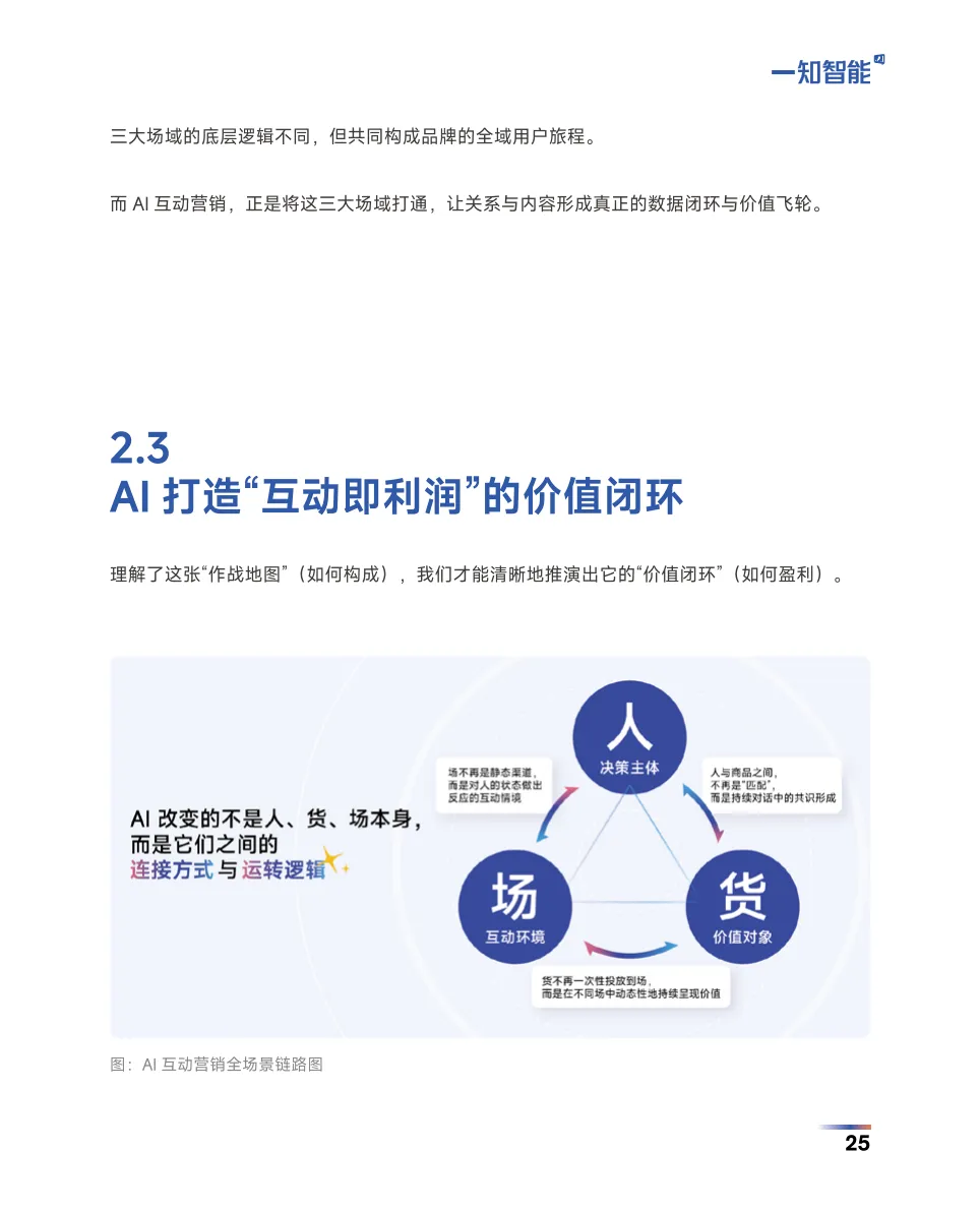 导读:报告聚焦 AI 技术对品牌营销的革新,剖析流量红利消退后行业从 “流量经营” 向 “关系经营” 的转型逻辑。白皮书指出,当前品牌面临成本高企、运营失焦、数据分散等困境,消费者决策路径碎片化与 AI 工具应用迷航加剧增长焦虑。AI 互动营销以 “模型为根、场景为干、增长为冠”,通过理解、生成、决策三大核心能力,构建 “公域 - 私域 - 内容” 全域互动体系,实现规模化与个性化的平衡。针对不同类型品牌,白皮书提供定制化增长方案,内容驱动型品牌可借 AI 放大创意产能,体验驱动型品牌能用 AI 精炼线索,关系经营型品牌可通过 AI 守护用户生命周期价值,渠道驱动型品牌则依托 AI 实现全域协同。一知智能通过 “太一” 垂直大模型与多 Agent 矩阵,已助力 2000 + 头部品牌实现互动质量与转化效率的双重提升,为行业提供可落地的 AI 营销解决方案。