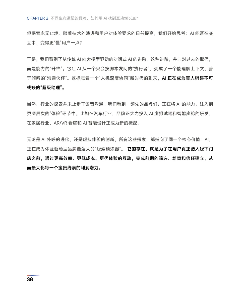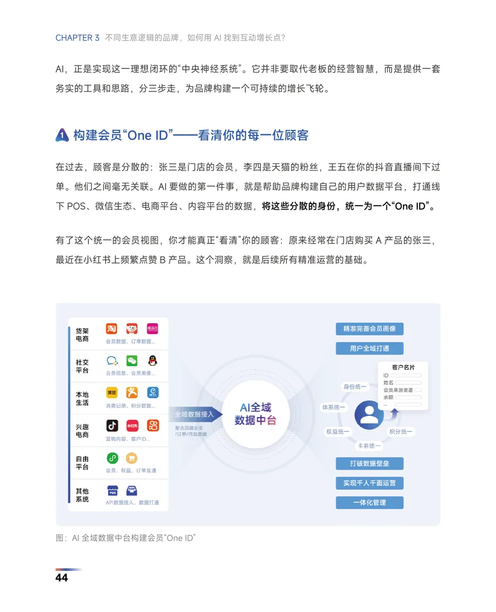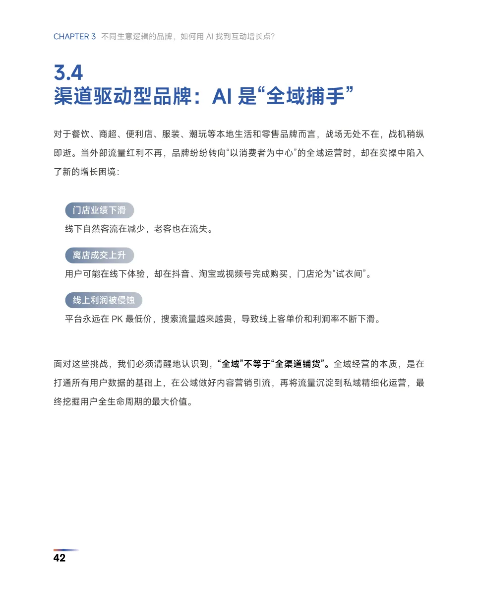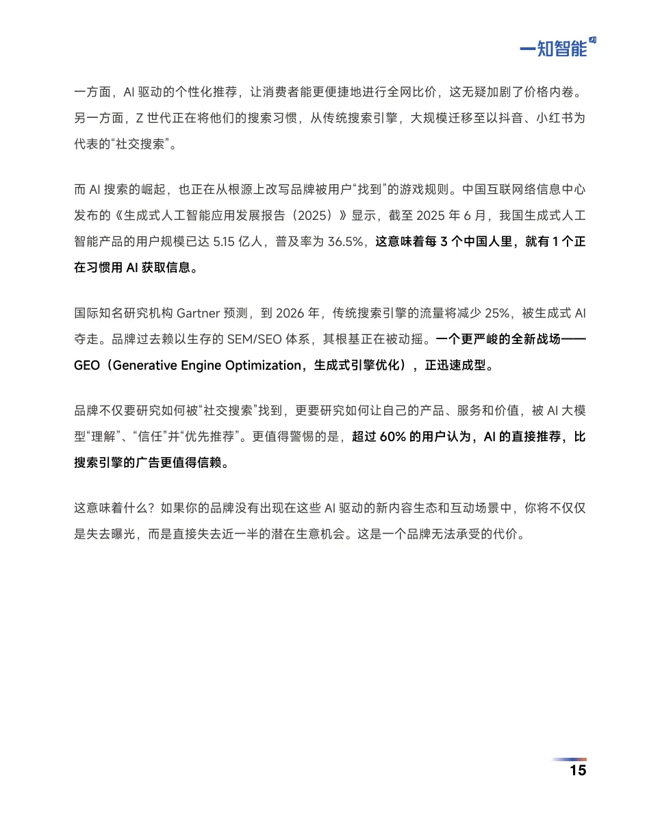 导读:报告聚焦 AI 技术对品牌营销的革新,剖析流量红利消退后行业从 “流量经营” 向 “关系经营” 的转型逻辑。白皮书指出,当前品牌面临成本高企、运营失焦、数据分散等困境,消费者决策路径碎片化与 AI 工具应用迷航加剧增长焦虑。AI 互动营销以 “模型为根、场景为干、增长为冠”,通过理解、生成、决策三大核心能力,构建 “公域 - 私域 - 内容” 全域互动体系,实现规模化与个性化的平衡。针对不同类型品牌,白皮书提供定制化增长方案,内容驱动型品牌可借 AI 放大创意产能,体验驱动型品牌能用 AI 精炼线索,关系经营型品牌可通过 AI 守护用户生命周期价值,渠道驱动型品牌则依托 AI 实现全域协同。一知智能通过 “太一” 垂直大模型与多 Agent 矩阵,已助力 2000 + 头部品牌实现互动质量与转化效率的双重提升,为行业提供可落地的 AI 营销解决方案。