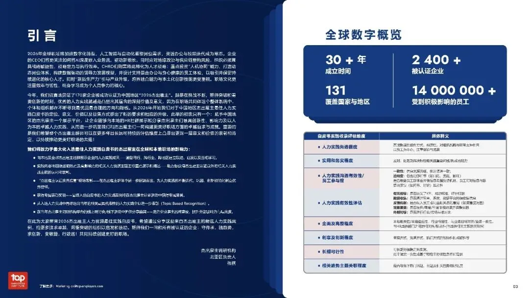 人力实践正从“成本中心”转向“战略增长引擎”,企业竞相以AI赋能与员工体验重塑竞争壁垒。报告显示,赛诺菲AI助手为员工每周省时5.2小时,百胜中国将餐厅招聘效率提升80%,辉瑞播客播放量超267万次——数据印证“科技+人文”双轮驱动已成标配。其深层逻辑在于,面对地缘政治与技能迭代压力,组织唯有将人力资源深度嵌入业务流,通过数据化洞察、敏捷化响应与生态化共建,才能构筑可持续的人才护城河。