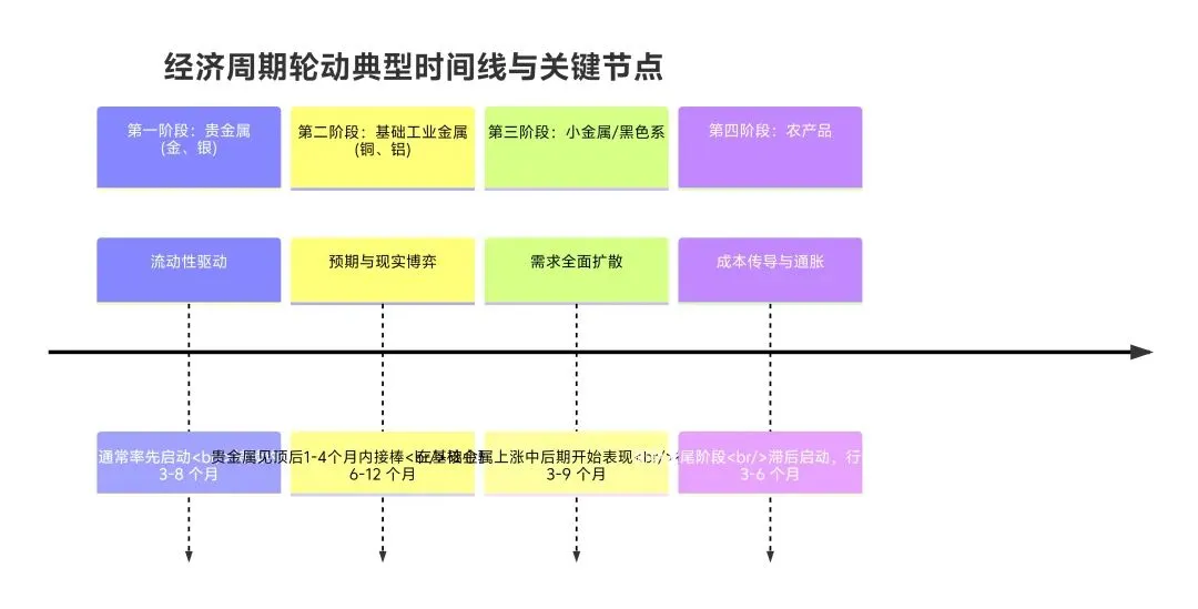 你看,理想情况下,这个车轮从黄金开始转到粮食,一套下来可能要两三年。但现实中,它经常卡在半路。比如黄金涨完了,大家等着铜铝涨,结果发现房子还是没人买,基建开工也不及预期,那行情可能就在“第二阶段”熄火了,后面的钢、粮就更没戏了。这就是为什么轮动的时间根本没法预测,有时候两个阶段紧密衔接,几个月就完成切换;有时候在一个阶段能反复震荡折腾一两年。