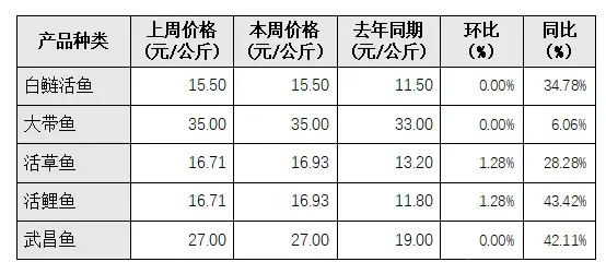 本周重点监测的水产品中,白鲢活鱼、大带鱼和武昌鱼价格与上周持平,活草鱼和活鲤鱼价格比上周小幅上涨1.28%。(详见表4)。