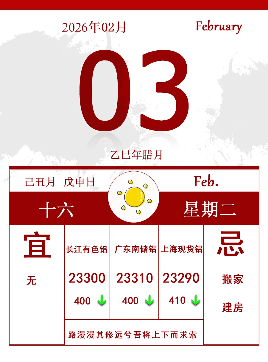 现货方面,市场情绪全面走弱,多空资金均表现出逃离意愿,恐慌情绪仍需要一定时间消化,使得铝价高位调整压力加大。基本面而言,铝锭及铝棒持续累库,下游淡季需求疲软,叠加用工企业逐渐进入春节放假阶段,需求进一步下行,节前适当减轻仓位以应对春节期间市场不确定性。关于沪铝及现货铝后市的看法,欢迎各位在评论区留言,所有留言一律精选。