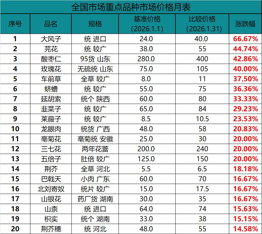 2026年开年,中药材市场呈现久违的积极变化。上涨品种数超越下跌品种数,是自本轮熊市下行周期以来首次出现的积极信号,表明市场整体下行压力得到极大缓解,底部支撑正在夯实。