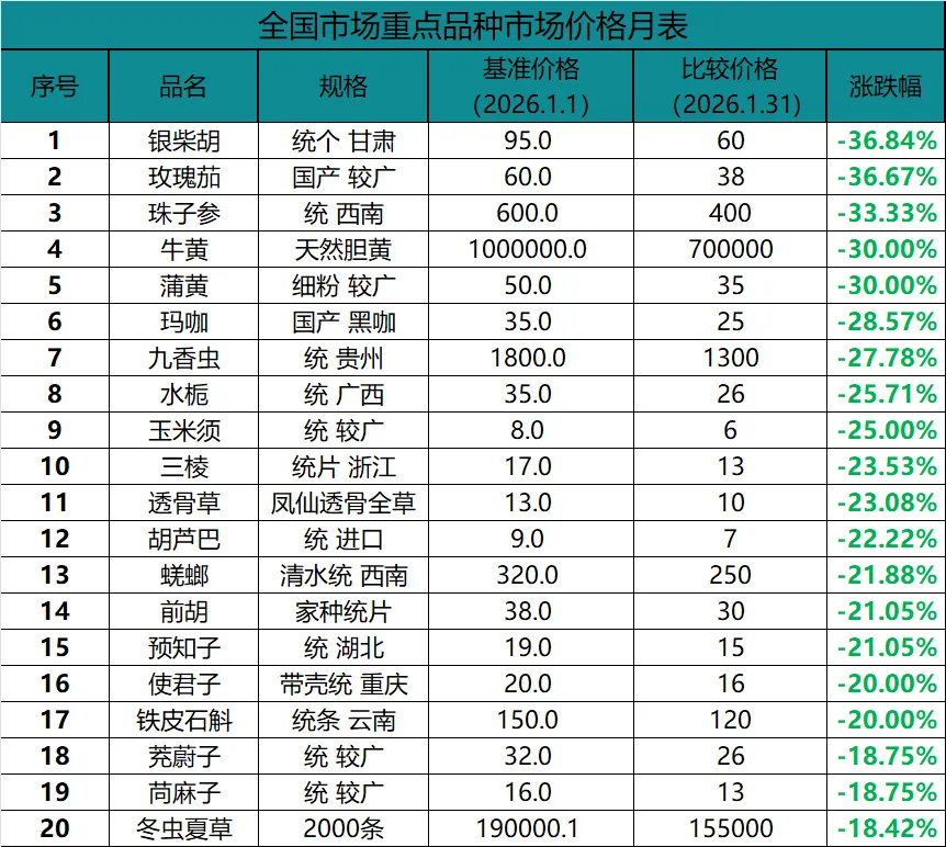 天然牛黄(-30.00%)和冬虫夏草(-18.42%)的跌势未止,表明这类曾被资本极度推高的“奢侈品”药材,其价值回归过程漫长而痛苦,仍在寻找新的价格锚点。