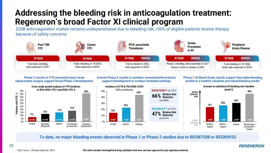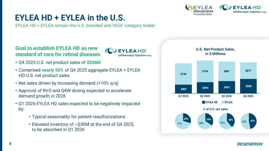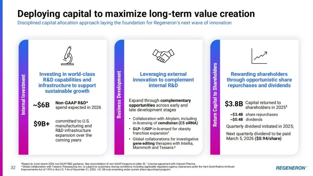 再生元最引以为傲的,莫过于它那套独步天下的技术底盘 —— 把基因、蛋白质组学和大数据揉在一起,搭建出全球最大的 DNA 与蛋白质组学关联医疗数据库。这就像给药物研发装上了导航,从靶点发现到临床试验,每一步都能精准定位。靠着 VELOCIMMUNE 全人源抗体平台、VELOCI-BI 双抗技术,再加上 siRNA、基因编辑这些硬核工具,公司在免疫学、眼科、肿瘤学等六大治疗领域布下了约 45 个临床项目,14 款自研疗法已经获批上市,这样的成绩单,在行业里绝对算得上亮眼。时间拉回到 2025 年第四季度,再生元交出了一份相当漂亮的财务答卷:总营收达到 39 亿美元,非 GAAP 每股收益 11.44 美元。核心产品的表现更是可圈可点,Dupixent(度普利尤单抗)全球净销售额飙到 49 亿美元,同比增长 32%,全球有超过 140 万患者在使用这款药。它在全球已经拿下 8 项适应症,2025 年 11 月刚在欧盟获批慢性自发性荨麻疹适应症,过敏性真菌性鼻窦炎的补充申请也拿到了优先审评资格,2026 年 2 月就能知道结果。更让人期待的是,公司对赛诺菲的研发余额偿付预计 2026 年中就能完成,这无疑会给合作收入增长添上一把火。再看眼科领域的明星产品 EYLEA HD(阿柏西普 8mg),2025 年第四季度在美国的销售额达到 5.06 亿美元,占整个 EYLEA 系列美国销售额的近一半。它不仅在美欧获批了视网膜静脉阻塞黄斑水肿适应症,还拿到了全适应症每月给药的许可,医生和患者的选择余地一下子就大了不少。不过稍微有点小插曲,2026 年第一季度的销售可能会受季节因素和库存消化的影响,增速大概率会放缓。肿瘤板块同样看点十足。Libtayo(西米普利单抗)2025 年全年净销售额 14.5 亿美元,同比增长 17%,在晚期非小细胞肺癌和皮肤癌治疗领域稳稳占据一席之地。新晋选手 Lynozyfic(林妥昔单抗)更是一鸣惊人,作为治疗复发 / 难治多发性骨髓瘤的 BCMA 双抗,它的完全缓解率高达 45%,远超同类产品,而且给药方案更简化,住院天数也更少,上市没多久就挤进了 50 多个医保目录,这样的市场穿透力,确实不一般。管线里那些蓄势待发的候选药物,同样藏着不少惊喜。就拿 Fianlimab(LAG-3 抗体)联合 Libtayo 的组合来说,早期临床数据显示,针对一线转移性黑色素瘤的客观缓解率达到 57%,中位无进展生存期更是突破了 24 个月,这样的成绩,让业界对它 2026 年上半年公布的三期数据充满期待。还有 Cemdisiran(C5 siRNA),治疗全身性重症肌无力的三期试验中,它改善患者日常生活活动能力的效果,在同类 C5 抑制剂里拔得头筹,2026 年第一季度提交新药申请后,很可能会成为这个领域的新标杆。在抗凝和代谢疾病领域,再生元也走出了自己的特色。两款 Factor XI 抗体 REGN7508 和 REGN9933,一个主打强效抗凝,一个聚焦低出血风险,能根据不同患者的需求精准匹配,这种 “定制化” 的治疗思路,说不定会改写抗凝药物的市场格局。肥胖治疗领域引进的 Olatorepatide(GIP/GLP-1 双靶点激动剂)也值得关注,它单药或者联合 Praluent(PCSK9 抑制剂)使用,既能减重又能降血脂,2026 年启动的三期临床试验,很可能会在这个竞争激烈的赛道里撕开一道口子。基因治疗这块版图,再生元玩得也很溜。它没有闭门造车,而是选择和 Alnylam、Intellia 这些顶尖公司联手,在 siRNA、CRISPR 等技术路线上多点开花。比如治疗遗传性听力损失的 DB-OTO 基因疗法,2026 年上半年就有望拿到 FDA 的审批结果,一旦获批,将为无数听障患者带来新的希望。资本运作层面,再生元也展现出了老道的手笔。公司计划拿出约 60 亿美元投入内部研发,同时通过外部合作不断扩充管线。2025 年,它向股东返还了 38 亿美元的资本,既体现了对投资者的诚意,也彰显了公司稳定的现金流实力。2026 年,对再生元来说注定是忙碌而关键的一年。Dupixent 多个新适应症的审批、Fianlimab 联合疗法的三期数据公布、Cemdisiran 的新药申请进展…… 一个又一个里程碑节点,都将牵动着市场的神经。这家始终把 “以科学为本,为患者谋福” 刻在骨子里的企业,未来还能交出怎样的答卷?我们不妨拭目以待。