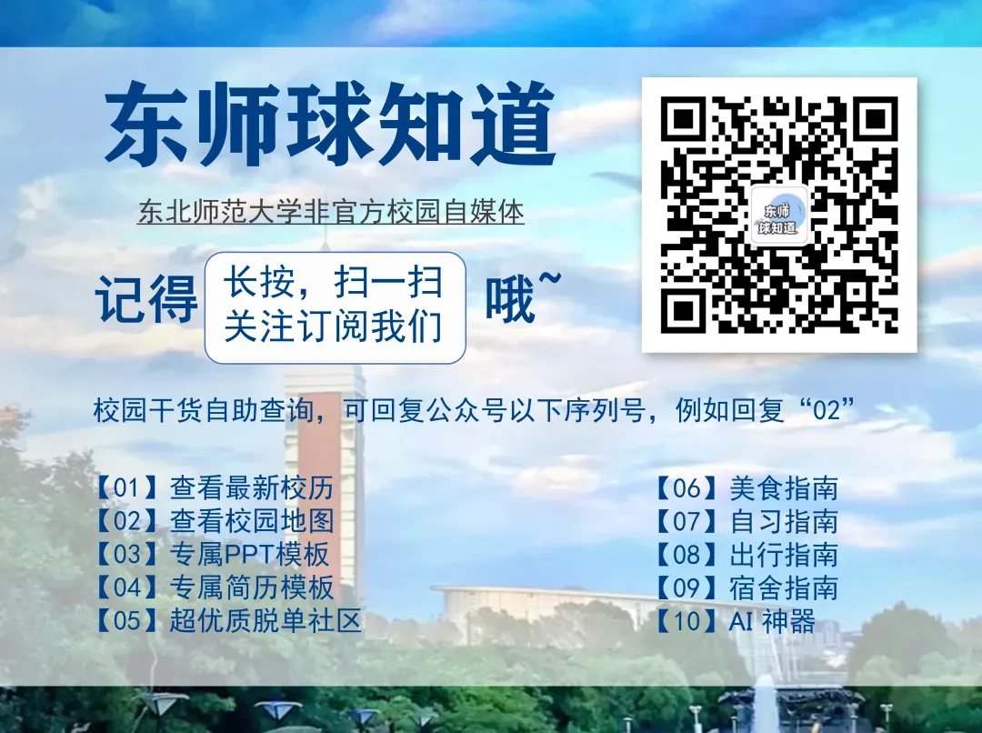 --关注微信公众号“东师球知道”-- “东北师范大学”PPT模板来了~ “东北师范大学”简历模板来啦~ “东北师范大学”历年真题来了 东师25级新生校花校草曝光~~ 2025全国高校预算TOP100!东师33.06亿! 东师er10月可参加的竞赛汇总! 2025东师互助群来啦! 各高校2026寒假时长排行榜!东师放假多少天?