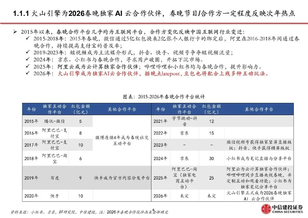 独立AI应用的商业价值得到验证,大模型无法"吞噬一切"。Meta收购AI应用Manus表明,即便拥有强大模型和超级平台,独立AI产品仍具战略价值。2026年国内C端AI应用进入关键期,字节、阿里、腾讯正通过"现有产品AI化+原生AI应用"双路径抢占入口。豆包日活已过亿,千问月活达千万级,元宝依托微信生态快速起量,春晚成为大厂展示AI能力的重要战场,火山引擎成为2026春晚独家AI云合作伙伴,反映出AI流量入口争夺的白热化。