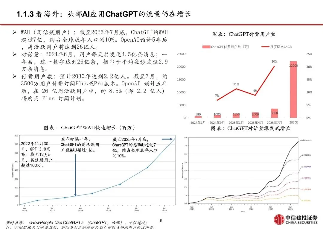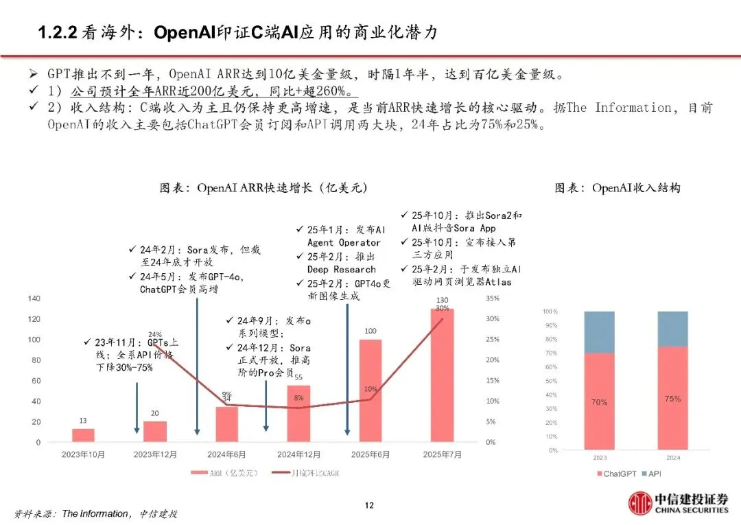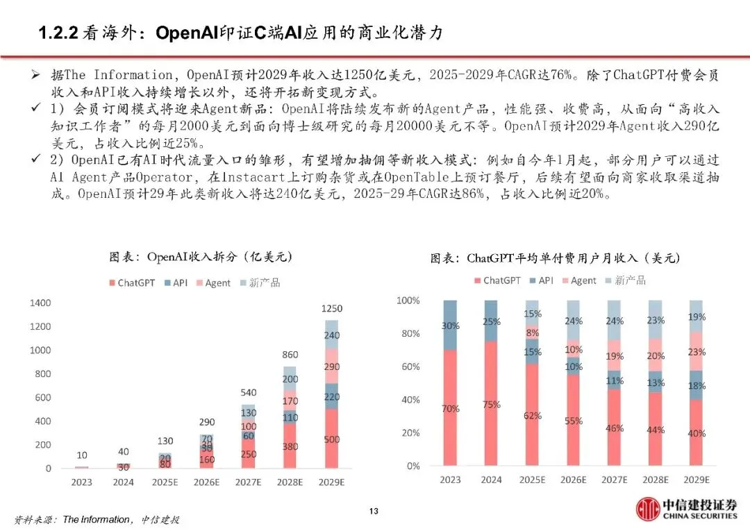 AI应用商业化有望加速,远超移动互联网时期。当前流量已被头部大厂占据,无需从零积累用户;同时可复用移动互联网成熟的变现模式。OpenAI的ARR在两年内从10亿增至近200亿美元,验证了C端AI应用的商业潜力。其收入结构中C端订阅占75%,并计划推出每月2000-20000美元的Agent新品,预计2029年Agent收入占比将达25%,渠道抽成等新收入模式贡献240亿美元,显示出清晰的盈利前景。