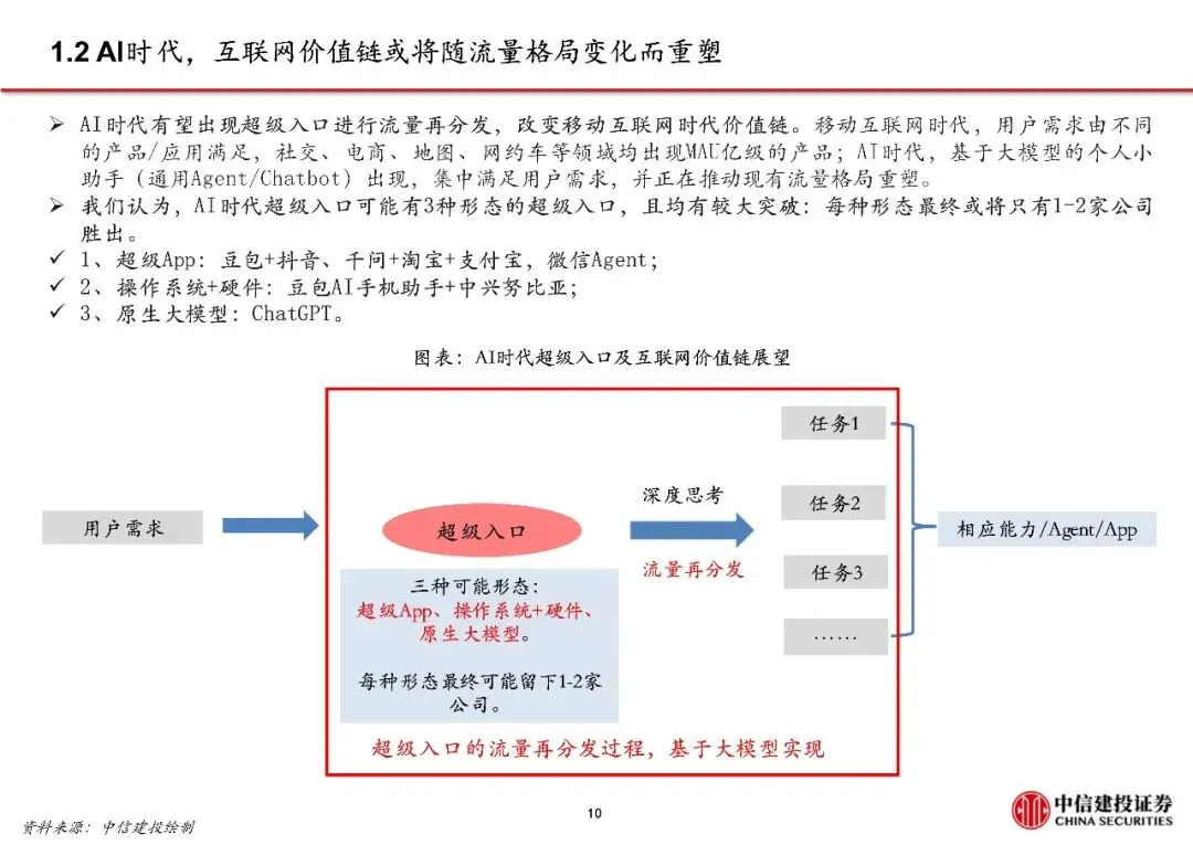 AI时代将诞生超级入口并重塑互联网价值链。报告提出超级入口可能呈现三种形态:超级App(豆包+抖音、千问+淘宝、微信Agent)、操作系统+硬件(豆包AI手机助手)、原生大模型(ChatGPT),每种形态最终或只剩1-2家胜出。AI助手将集中满足用户需求,改变移动互联网时代分散的产品格局,推动流量再分发和价值链重构。大厂依托现有生态将AI产品与超级App深度打通,强化既有优势。