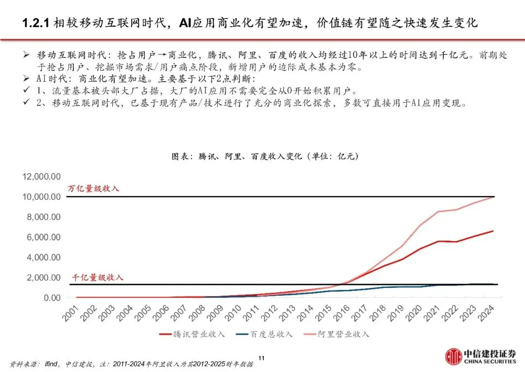 腾讯依托微信生态构筑独特优势。微信月活13.85亿,集成社交、内容、支付等全场景功能,具备成为终极AI Agent的潜力。元宝已嵌入微信聊天和评论区,可解析公众号文章和图片,未来将接入视频号内容。微信AI有望成为腾讯系生态的统一入口,实现搜索Agent、社交Agent、商业Agent三层演进。腾讯的投资主线指向三大方向:入口类公司(腾讯、阿里、字节)、大厂生态合作伙伴(易点天下、美图等)、受益于流量竞争的广告平台(分众传媒、B站),为投资者明确了产业价值捕获路径。