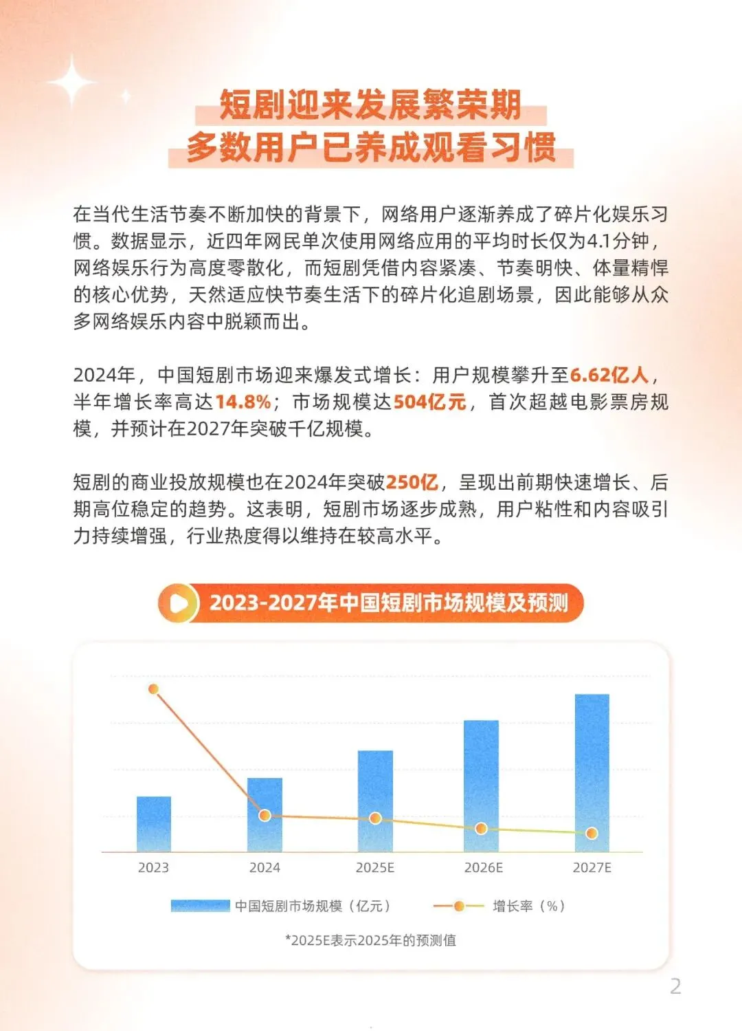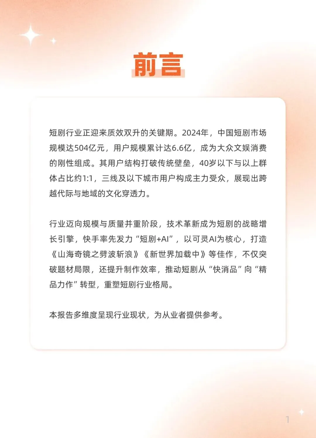 2024年中国短剧市场规模达504亿元,用户规模累计6.6亿,已成为大众文娱消费的刚性组成,其用户打破代际与地域壁垒,40岁以下与以上群体占比约1:1,三线及以下城市为核心受众。行业正从快消品向精品力作转型,技术革新成为关键引擎,AI的技术应用,突破题材局限、提升制作效率,推动短剧在内容品质、生产效率与商业模式上全方位升级。当前短剧市场呈现供给扩容、用户粘性增强、商业价值深化的特征,精品化、AI赋能、跨界融合成为发展主流,为行业可持续发展注入新活力。