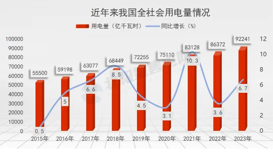 近年来,我国全社会用电量呈逐年攀升的态势。2023年,我国全社会用电量9.22万亿千瓦时,同比增长6.7%。自2015新一轮电改伊始的8年来,我国全社会用电量已累计增长36741亿千瓦时,超过2009年全国全社会用电量(2009年全社会用电量为36430亿千瓦时)。