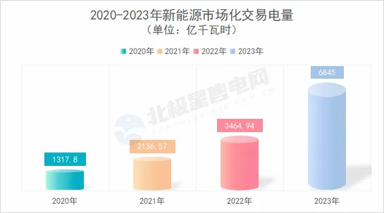 新能源逐步进入电力市场,市场化占比稳步提升。2020年到2023年,新能源市场化交易电量分别为1317.80亿千瓦时、2136.57亿千瓦时、3464.94亿千瓦时、6845亿千瓦时,占新能源总发电量的47.3%。