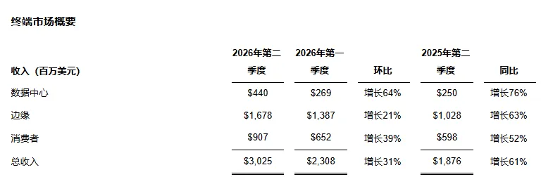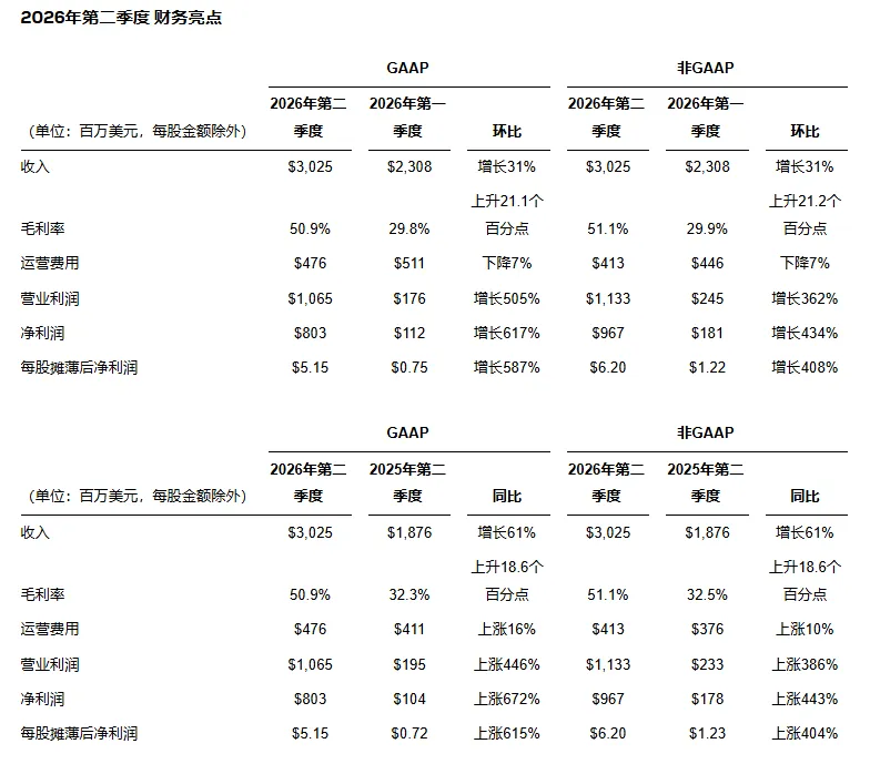 第二季度营收为 30.3亿美元 ,环比增长31%,超出指导区间,GAAP净利润为8.03亿美元 ($5.15 )。第二季度非GAAP每股摊薄后净利润为$6.20 .数据中心收入环比增长64%,主要得益于人工智能基础设施建设者、半定制客户以及大规模部署人工智能的技术公司强劲的采用需求。 预计第三季度营收将在44亿美元至48亿美元之间,非GAAP每股摊薄净利润预计将在12.00美元至14.00美元之间。