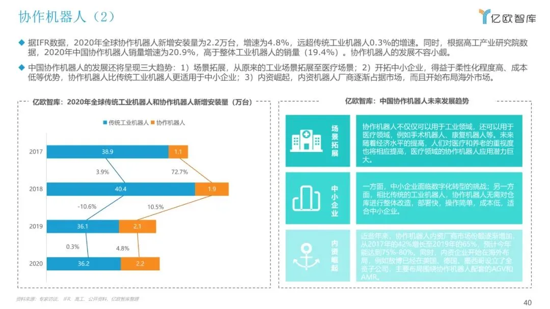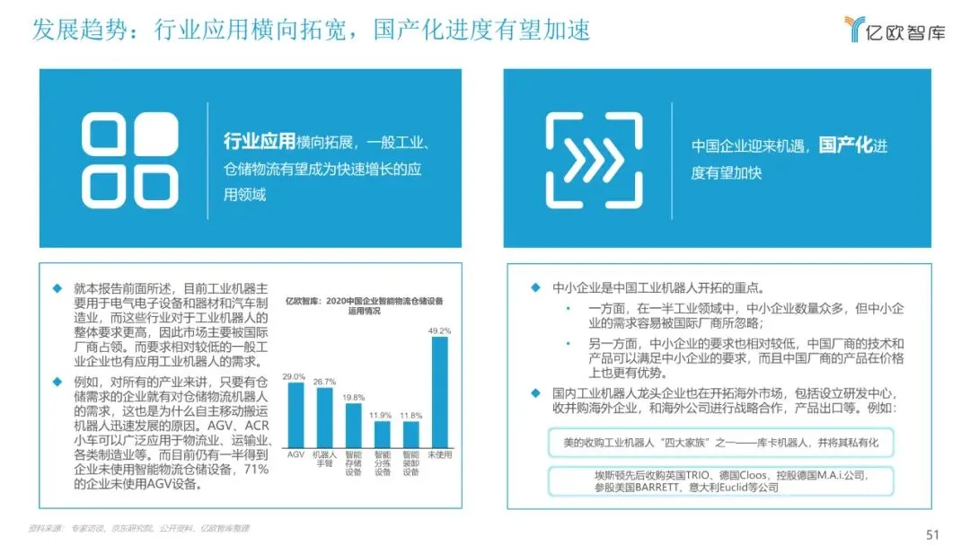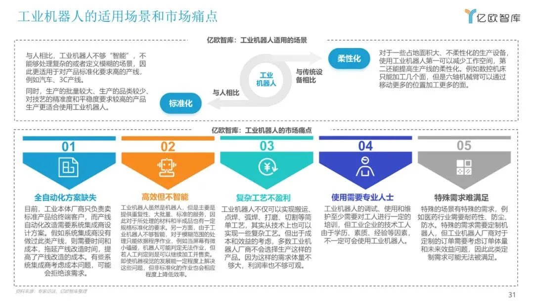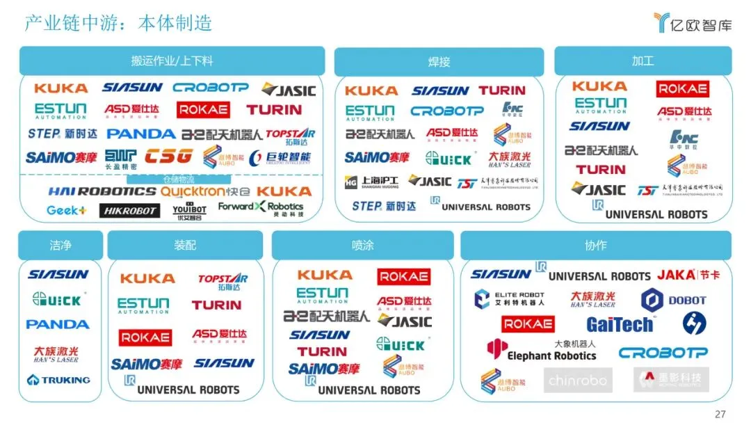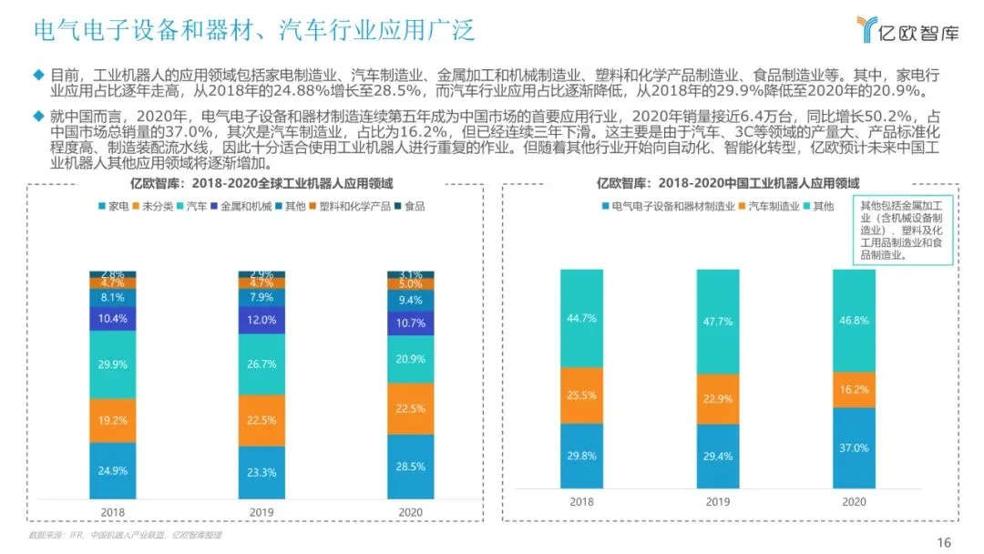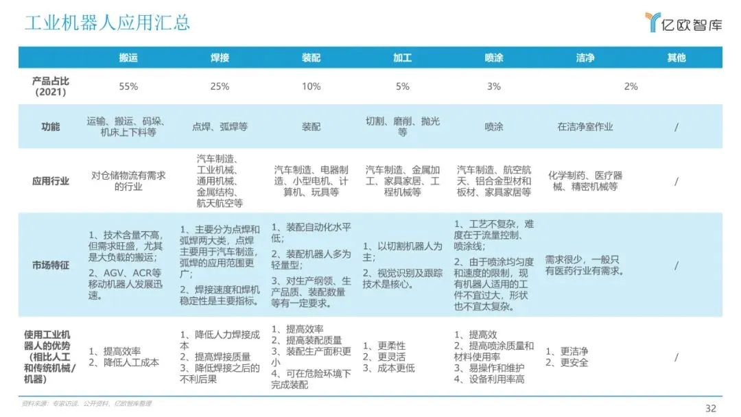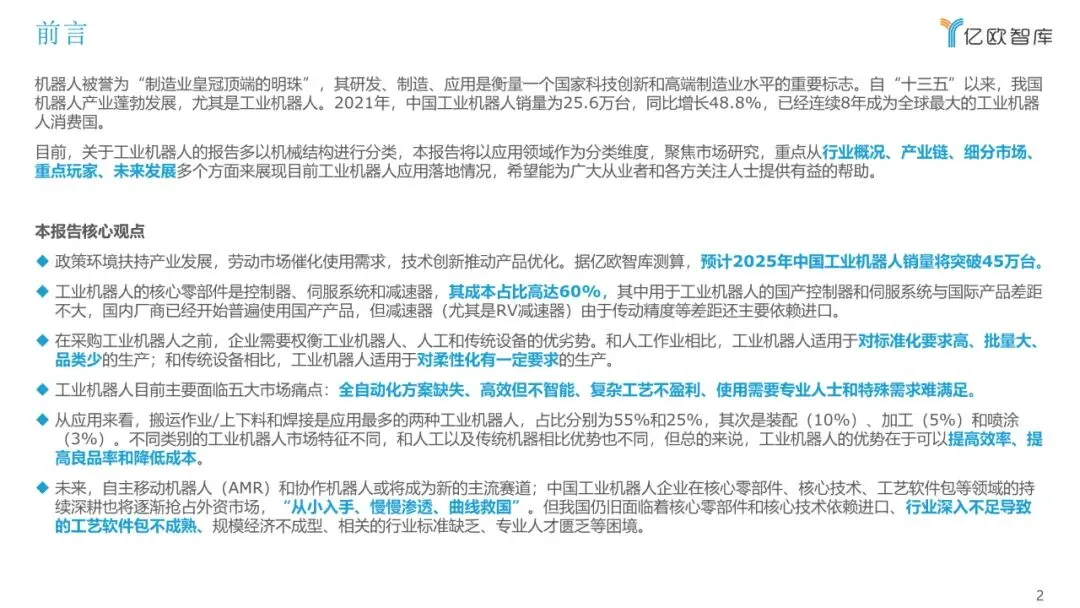 目前,关于工业机器人的报告多以机械结构进行分类,本报告将以应用领域作为分类维度,聚焦市场研究,重点从行业概况、产业链、细分市场、 重点玩家、未来发展多个方面来展现目前工业机器人应用落地情况,希望能为广大从业者和各方关注人士提供有益的帮助。
