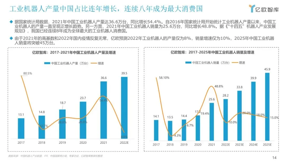 机器人被誉为“制造业皇冠顶端的明珠”,其研发、制造、应用是衡量一个国家科技创新和高端制造业水平的重要标志。自“十三五”以来,我国 机器人产业蓬勃发展,尤其是工业机器人。2021年,中国工业机器人销量为25.6万台,同比增长48.8%,已经连续8年成为全球最大的工业机器 人消费国。