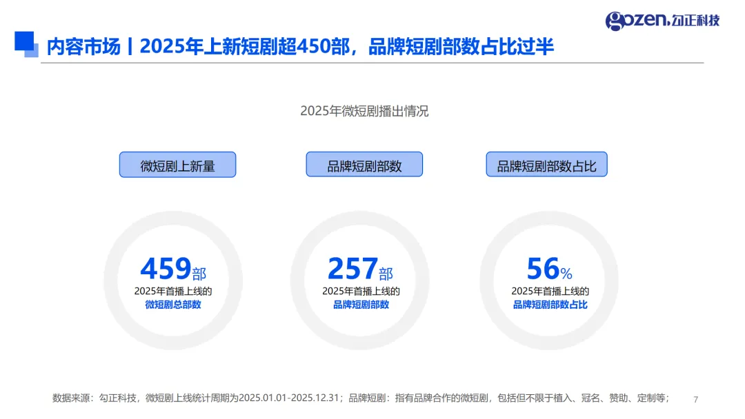市场大盘:2025年,抖音、快手上新非付费短剧459部,其中上新品牌短剧257部,数量占比56%;