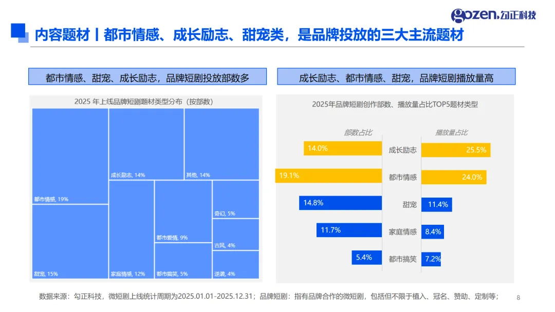 创作题材:都市情感、成长励志、甜宠类,是品牌投放的三大主流题材;