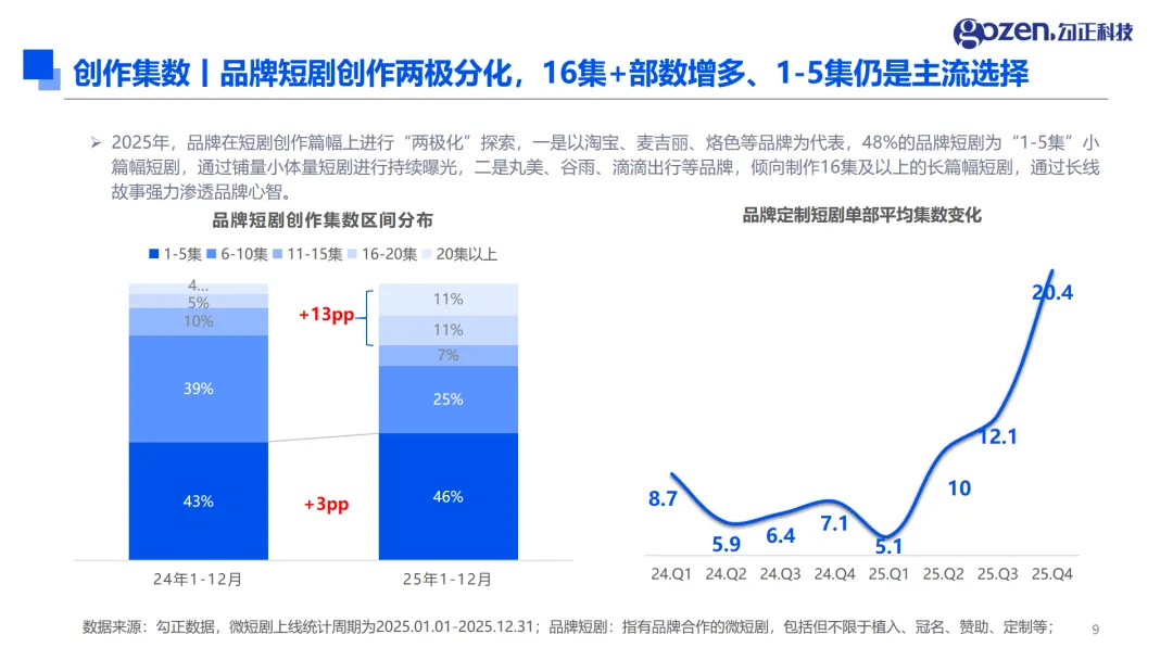 创作集数:2025年品牌短剧创作两极分化,16集+部数增多、1-5集仍是主流选择;