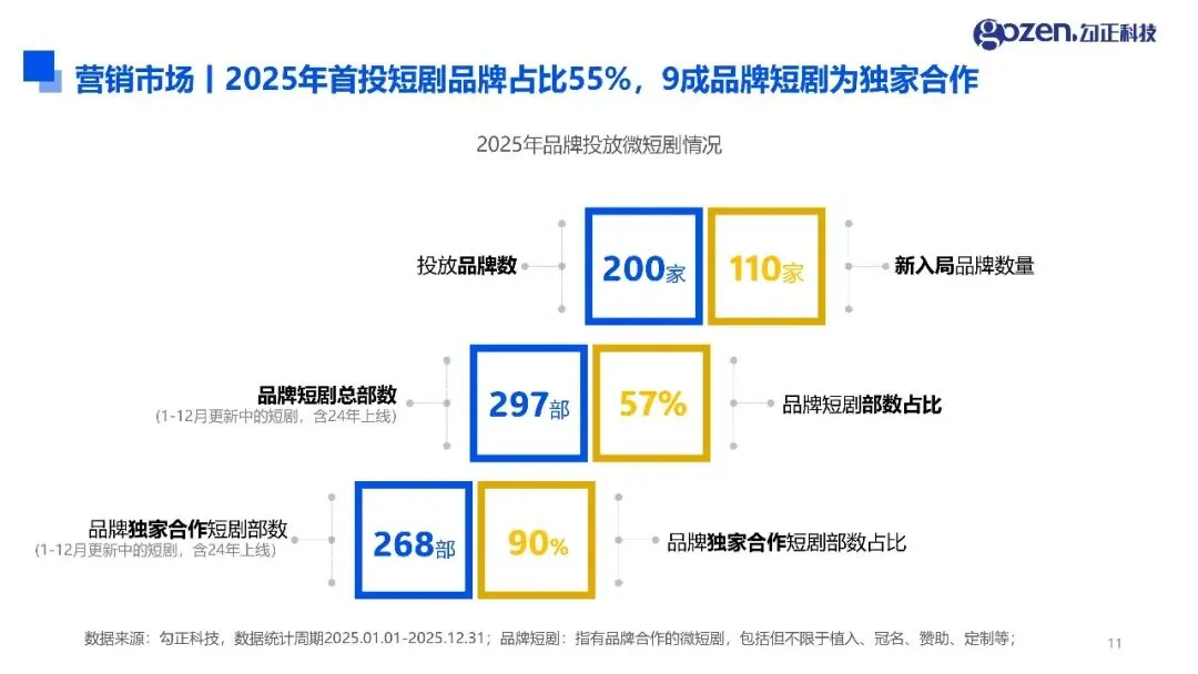 营销大盘:2025年在更中的品牌短剧297部、占比57%,其中268部、90%属于品牌独家合作,定制模式仍是品牌营销的主流方式;