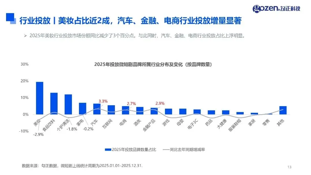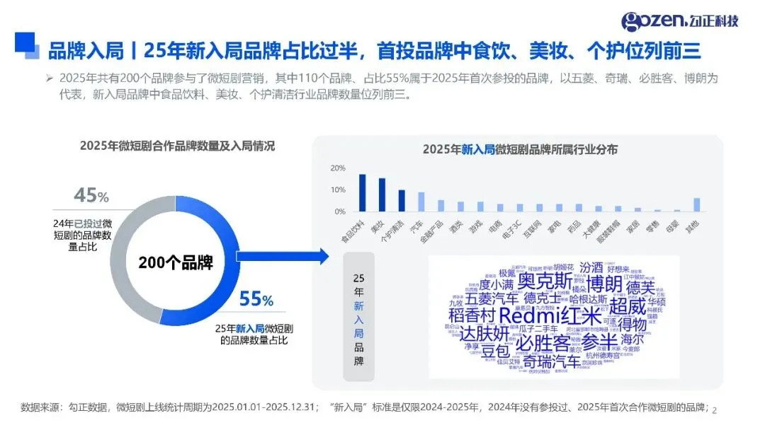入局情况:2025年新入局微短剧的品牌有110家、占比55%,新入局品牌中食品饮料、美妆、个护清洁行业品牌数量位列前三;