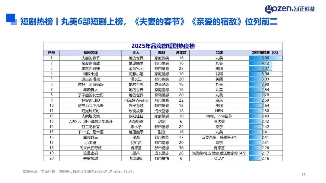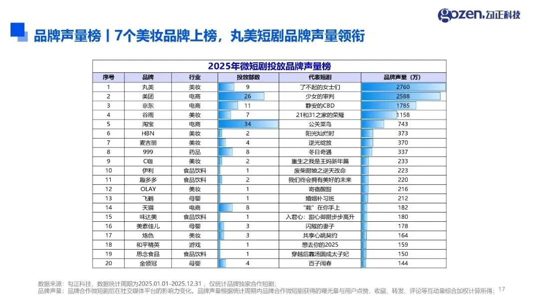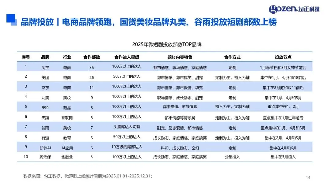 品牌合作:2025年电商品牌投放短剧部数领跑,国货美妆品牌丸美、谷雨投放短剧部数上榜;
